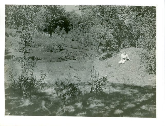 Black and white photograph of a woman sitting on the side of a hill in a wooded area. She has binoculars around her neck.