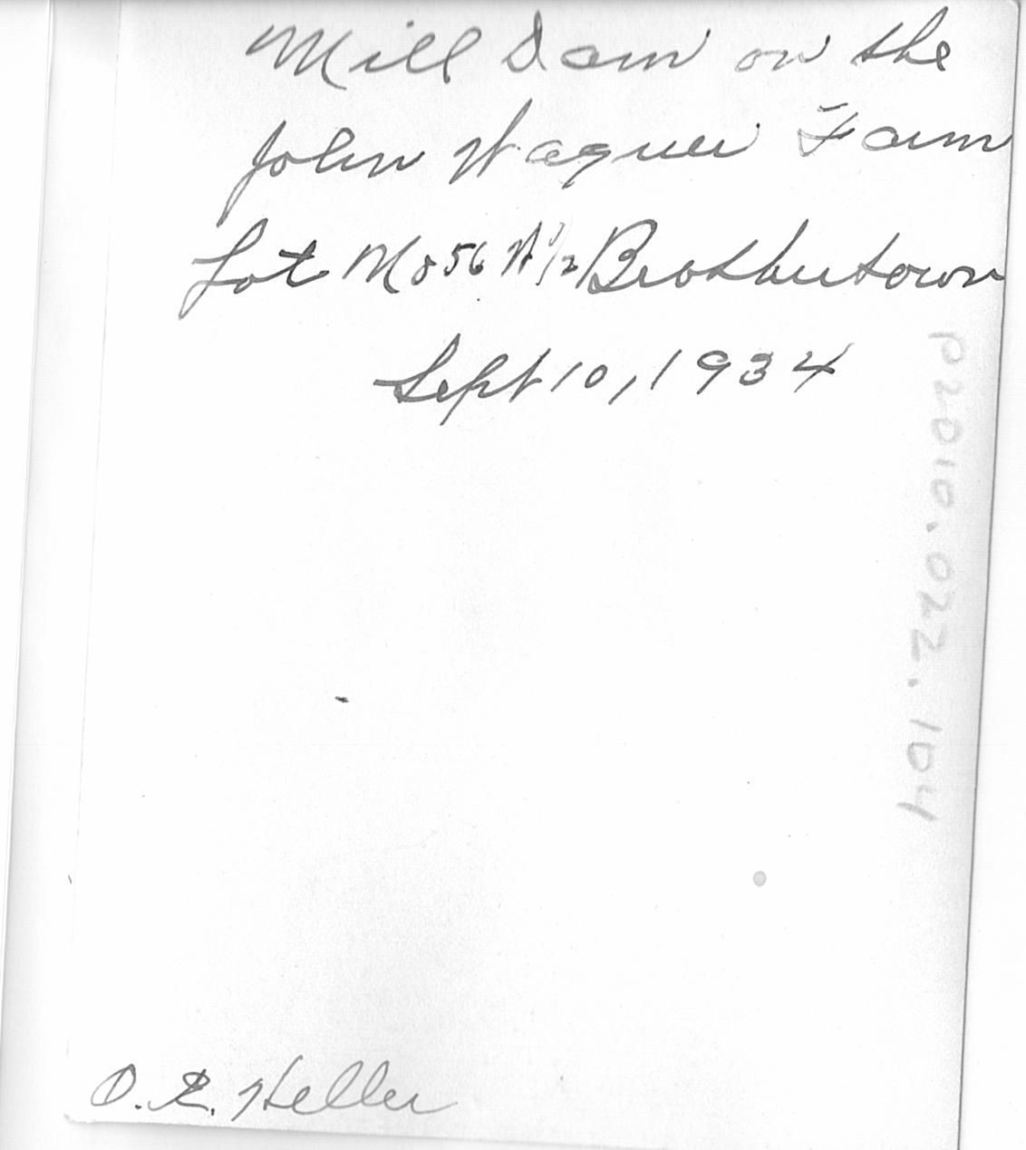 "Mill. I am on the John Wagner Farm Lot No 56, N 1/2, Brothertown. Sept. 10, 1934. O.E. Heller"Location