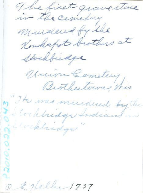 at Stockbridge. Union Cemetery, Brothertown, Wis. 'He was murdered by the Stockbridge Indians in Stockbridge'." And in