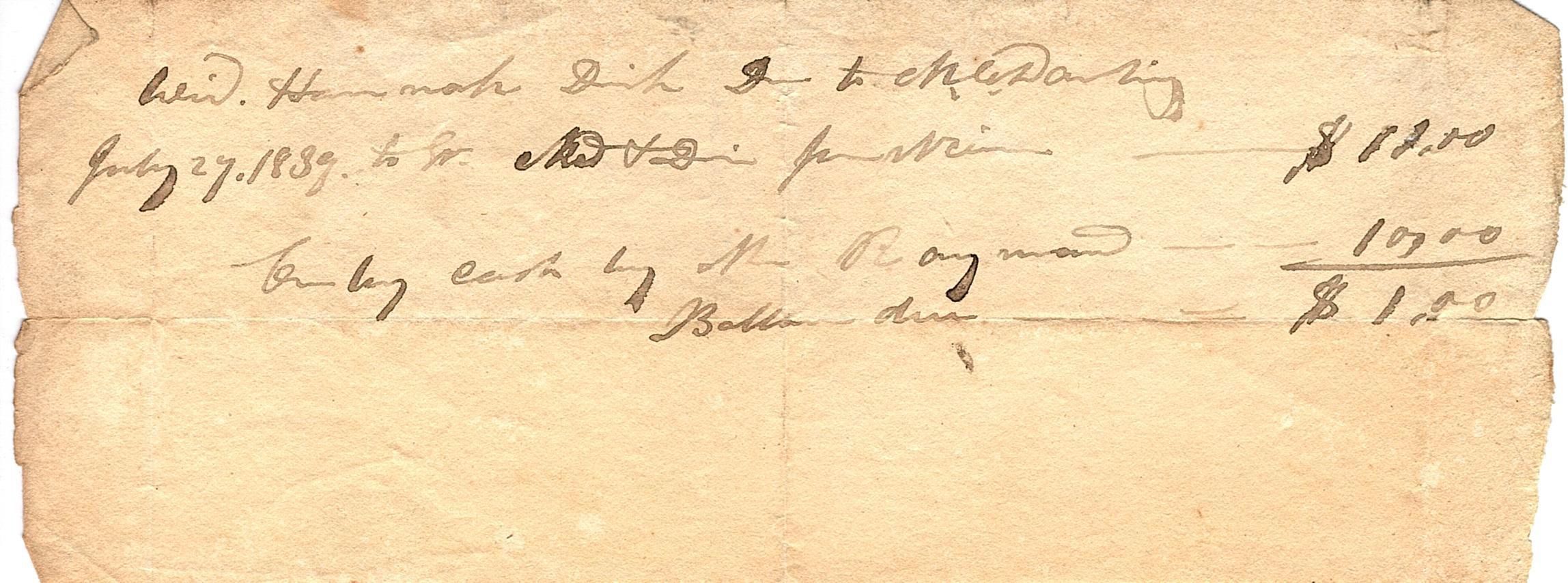 Small, torn sheet of paper with writing in black ink. The writing is difficult to read but there is a date along the second line of July 27, 1839 and calculations along the right side subtracting $11.00 from 10.00 to equal $1.00. Nothing is written on the back.Collection