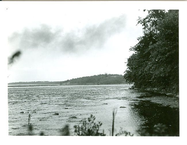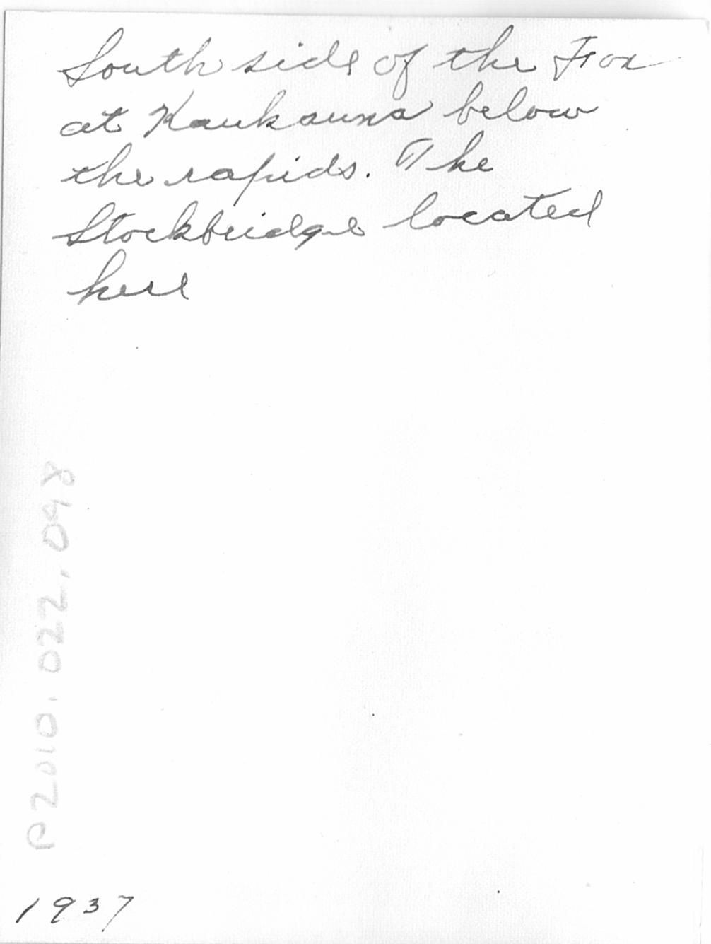 "South side of the Fox at Kaukauna below the rapids. The Stockbridge located here. 1937"Location
