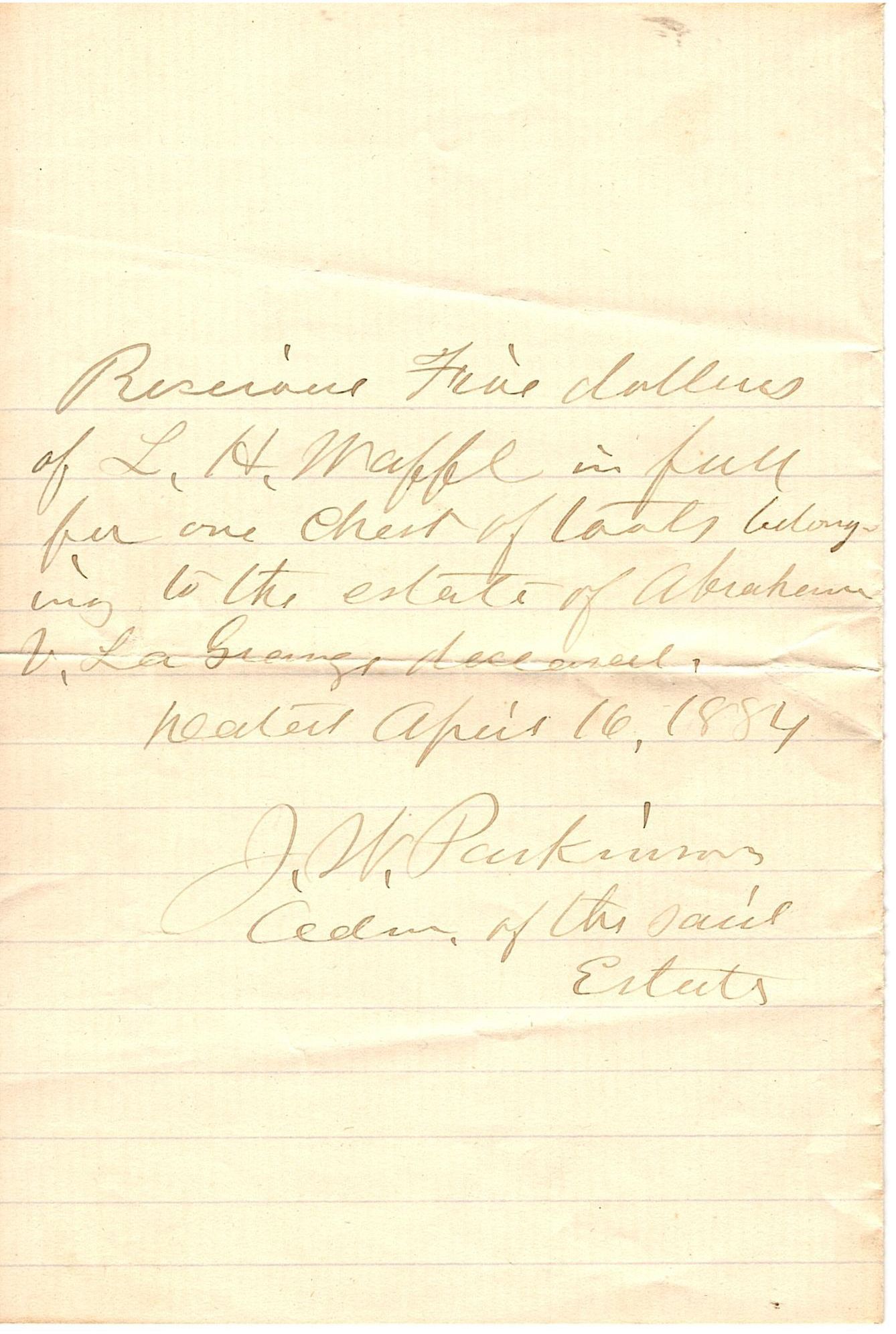 Small piece of notepad paper, lined with a receipt written in black ink that reads "Received five dollars of L.H. Waffle in full for one chest of -- belonging to the estate of Abraham C. La Grange, deceased. Dated April 16, 1884. J.W. Parkinns, Adm of the said Estate."Collection