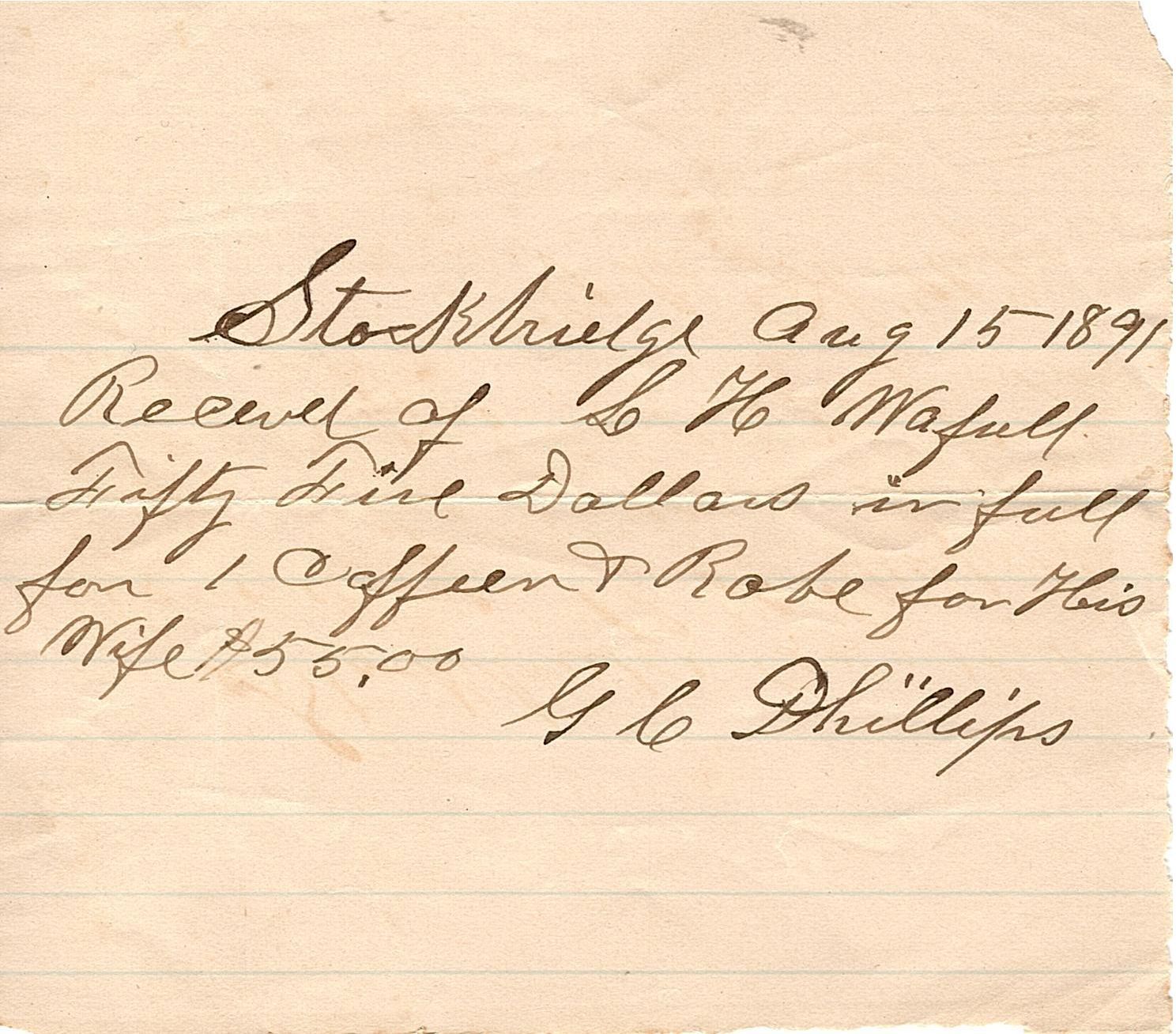 Partial sheet of blue-lined paper with writing in black ink that reads "Stockbridge Aug. 15, 1891. Received of L.H. Wafull [sic] (Waffle) Fifty Five Dollars in full for 1 Coffen [sic] and Robe for his wife $55.00" and signed by G.C. Phillips.Collection