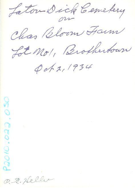 "Laton Dick Cemetery on Chris Bloom farm, lot no.1, Brothertown, Oct 2,1934" and written in the bottom right corner "O.E. Heller"Location