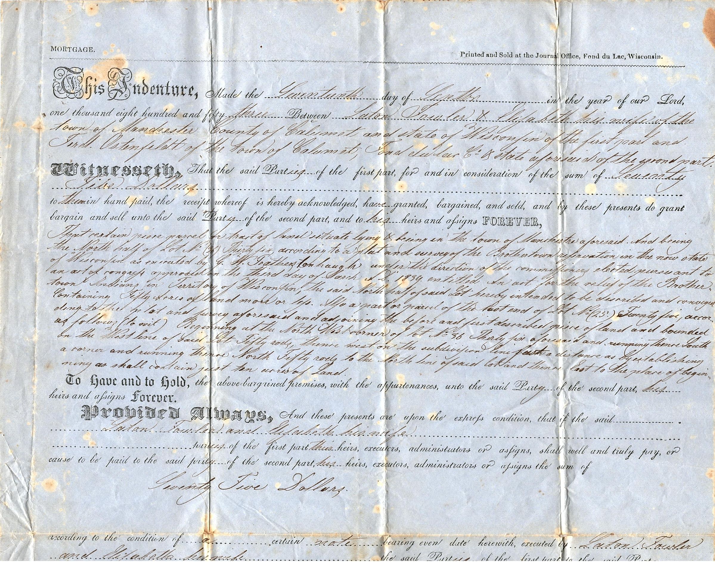 Oversized official document-mortgage. Laton Fowler and wife to Ford Ostenfeldt. Registers Office, Calumet County. Received for Record September 26th, 1853. The form is a blue paper "Printed and Sold at the Journal Office, Fond du Lac, Wisconsin" and filled in with black ink. The form was filled out on the Sept. 17, 1853.Collection