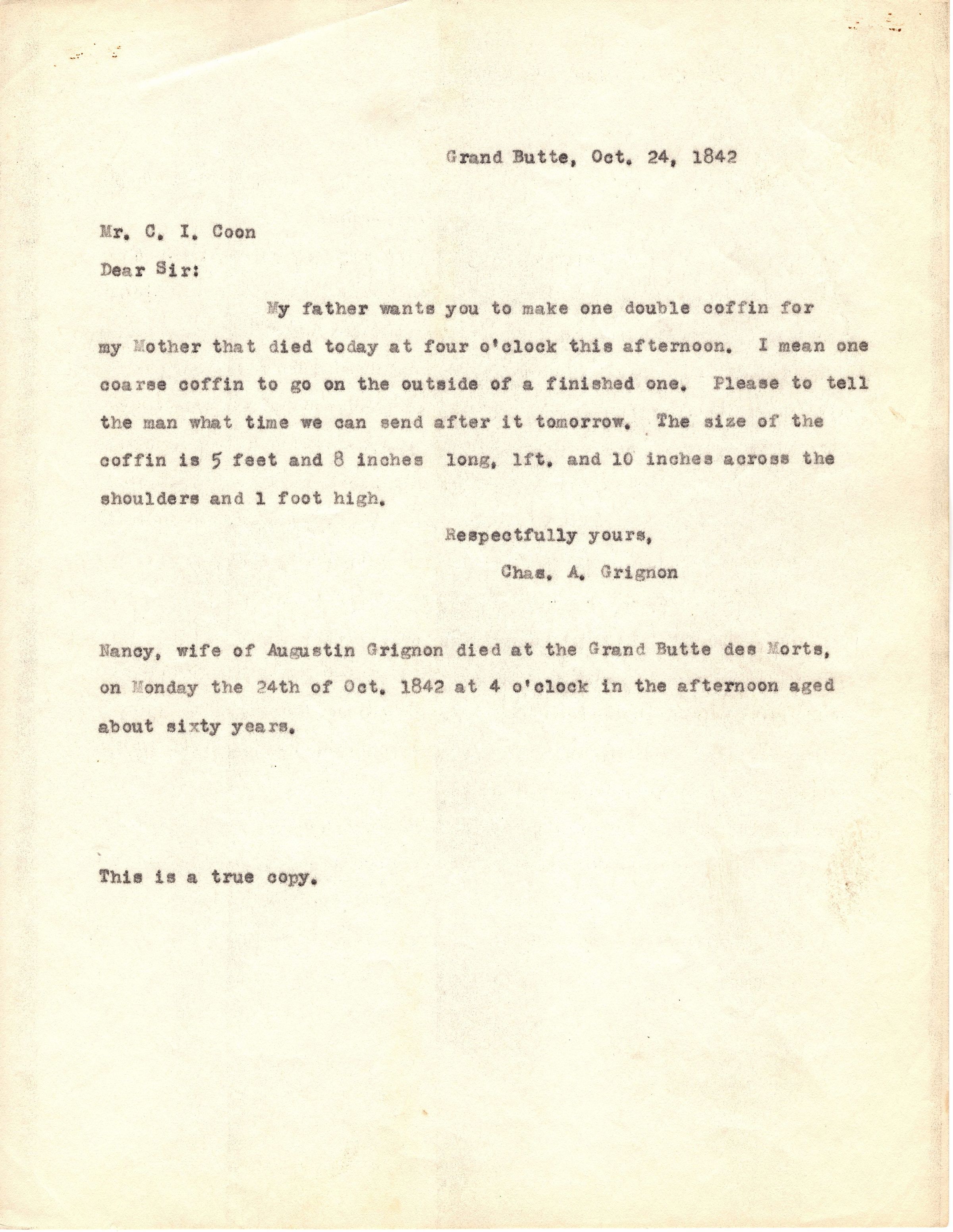 Single page typed correspondence that reads "Grand Butte, Oct. 24, 1842, Mr. C.I. Coon, Sir: My father wants you to make one double coffin for my Mother..." It is signed "Respectfully yours, Chas. A. Grignon" and has note about the death at the bottom: "Nancy, wife of Augustin Grignon died at the Grand Butte des Morts, on Monday the 24th of Oct. 1842 at 4 l'clock [sic] in the afternoon aged about sixty years". There are two copies of the same letter.Collection