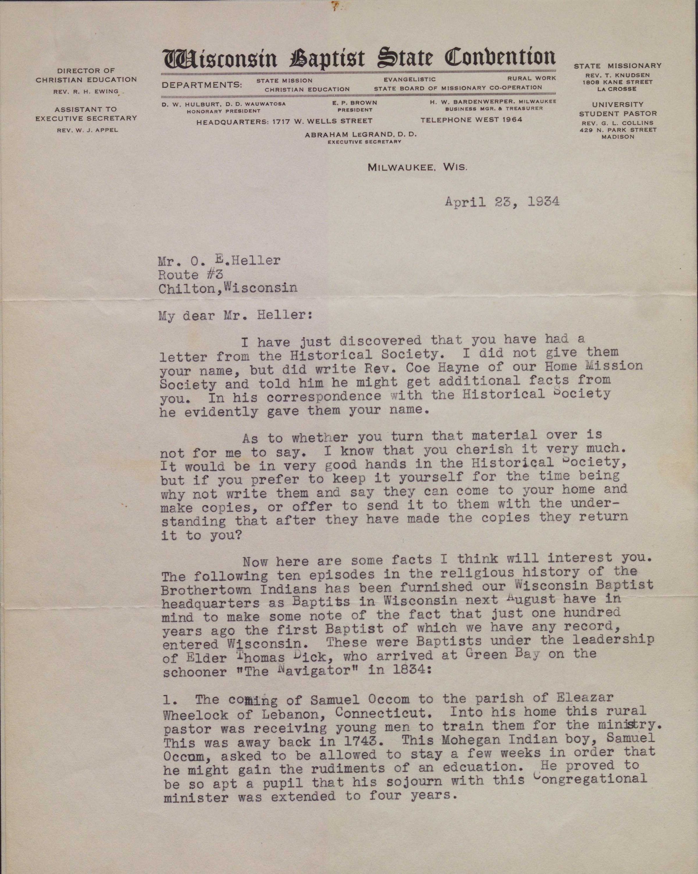 Three pages of typed correspondence on Wisconsin Baptist State Convention letterhead. It is addressed "April 23, 1934 Mr. O.E. Heller Route #3, Chilton, Wisconsin, My dear Mr. Heller" and addresses the letter from the state historical society and mentions Heller keeping the collection himself. It then presents a list of 10 facts about Brothertown history and the tribes connection to the Baptist faith. It is signed "Respectfully, A. LeGrand".