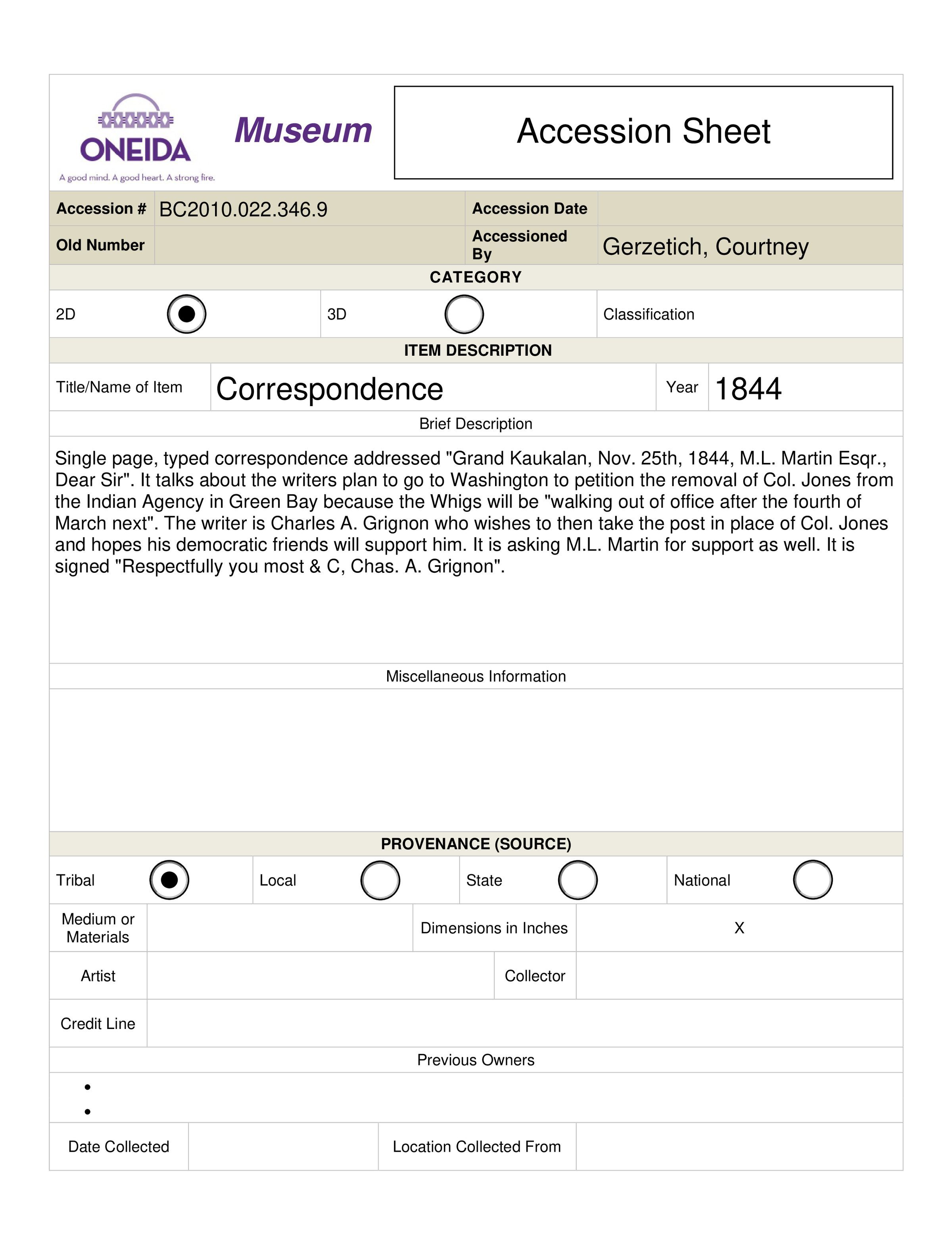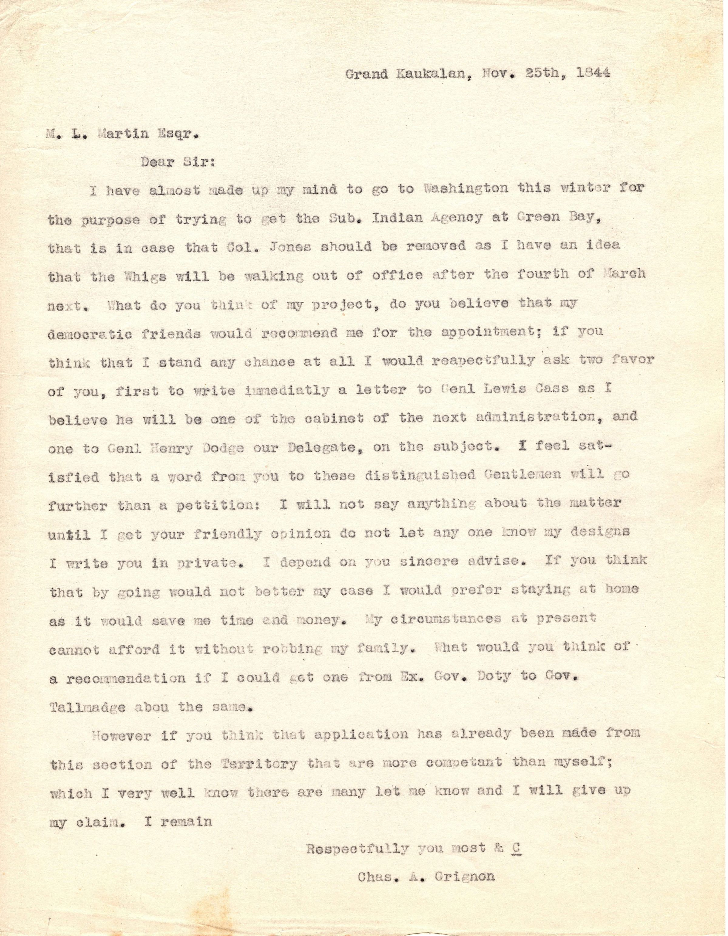 Single page, typed correspondence addressed "Grand Kaukalan, Nov. 25th, 1844, M.L. Martin Esqr., Dear Sir". It talks about the writers plan to go to Washington to petition the removal of Col. Jones from the Indian Agency in Green Bay because the Whigs will be "walking out of office after the fourth of March next". The writer is Charles A. Grignon who wishes to then take the post in place of Col. Jones and hopes his democratic friends will support him. It is asking M.L. Martin for support as well. It is signed "Respectfully you most & C, Chas. A. Grignon".Collection