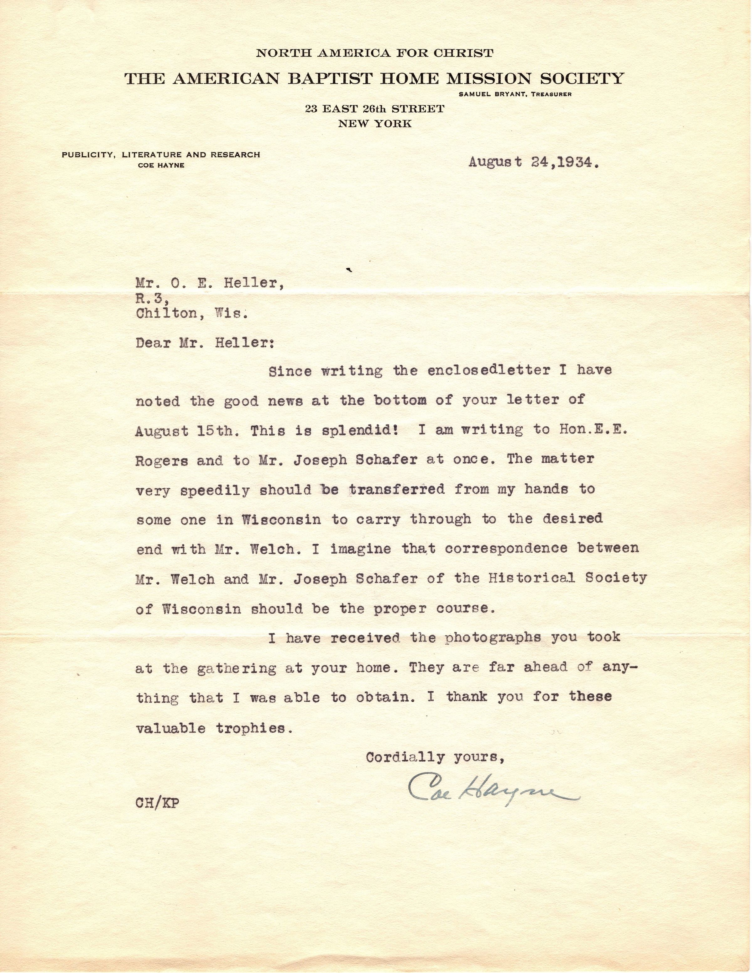 Single page, typed correspondence on North America for Christ, The American Baptist Home Mission Society letterhead. It is addressed "August 24, 1934 Mr. O.E. Heller, R. 3, Chilton, Wis." and adds to the previous letter about convincing Mr. Welch of the photocopy of the Brothertown book and appears that Mr. Welch agreed. This letter is from Coe Hayne.Collection