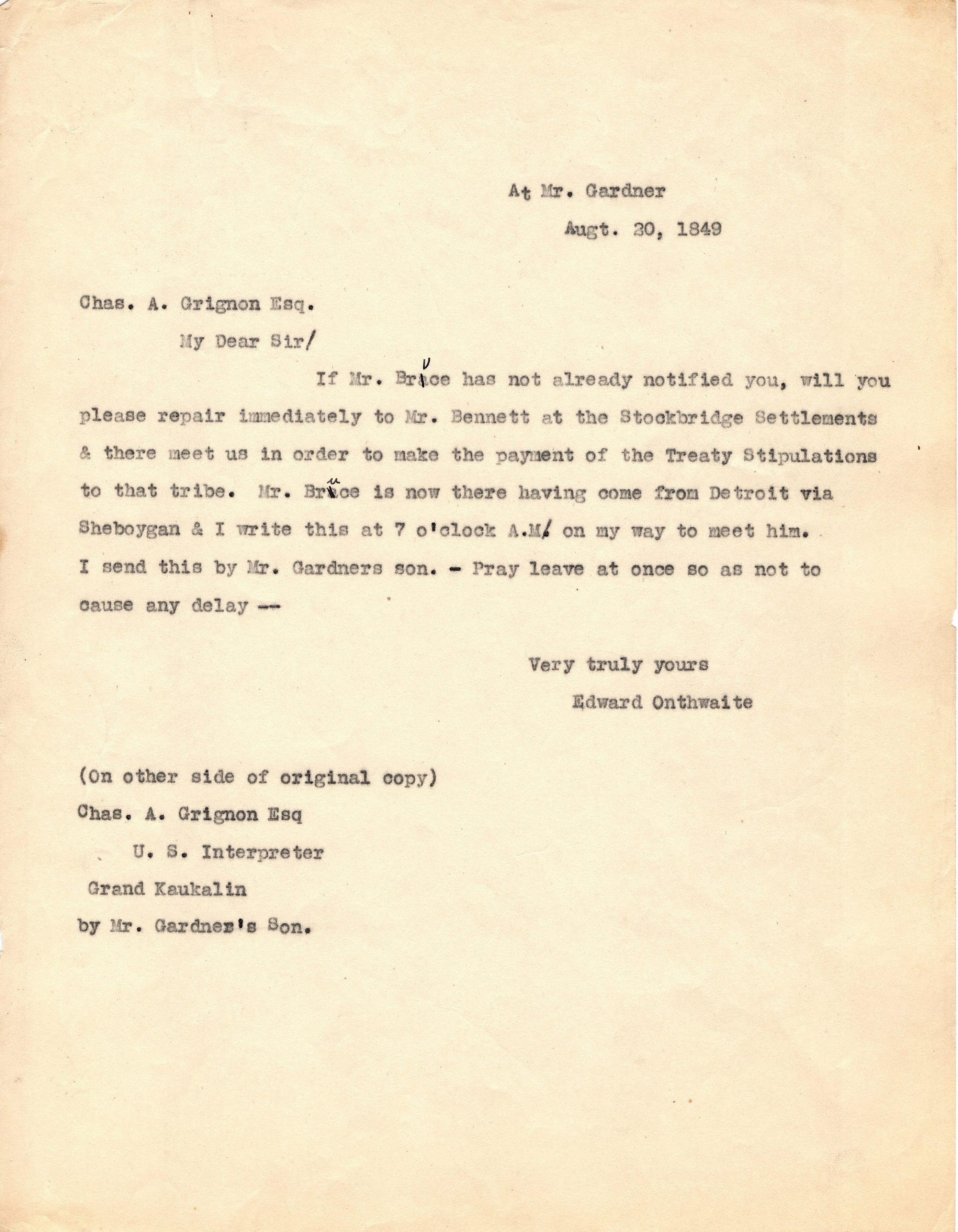 Single page, typed correspondence (copy) addressed "At Mr. Gardner, Augt. 20, 1849, Chas. A. Grignon Esq. My Dear Sir/ If Mr. Bruce has not already notified you, will you please repair immediately to Mr. Bennett at the Stockbridge Settlements & there meet us in order to make the payment of the Treaty Stipulations to that tribe. Mr. Bruce is now there having come from Detroit via Sheboygan & I write this at 7 o'clock A.M. on my way to meet him. I send this by Mr. Gardners son. --Pray leave at once so as not to cause any delay-- Very truly yours, Edward Onthwaite".Collection