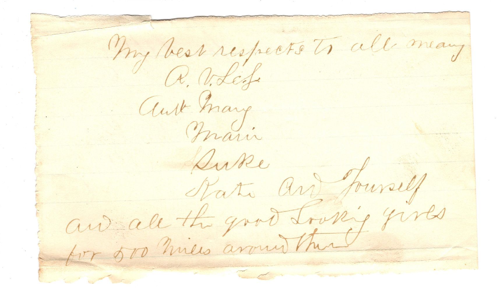 Fragment of a correspondence that has been torn from the rest of the paper. One one side it reads "From your affectionate cousin, Jacob La Grange, Albany" and on the other side "My best respects to all neary, R. V. Lefe, Aunt Mary, Marin, Suke, Rati and Yourself, and all the good looking girls for 500 miles around them."