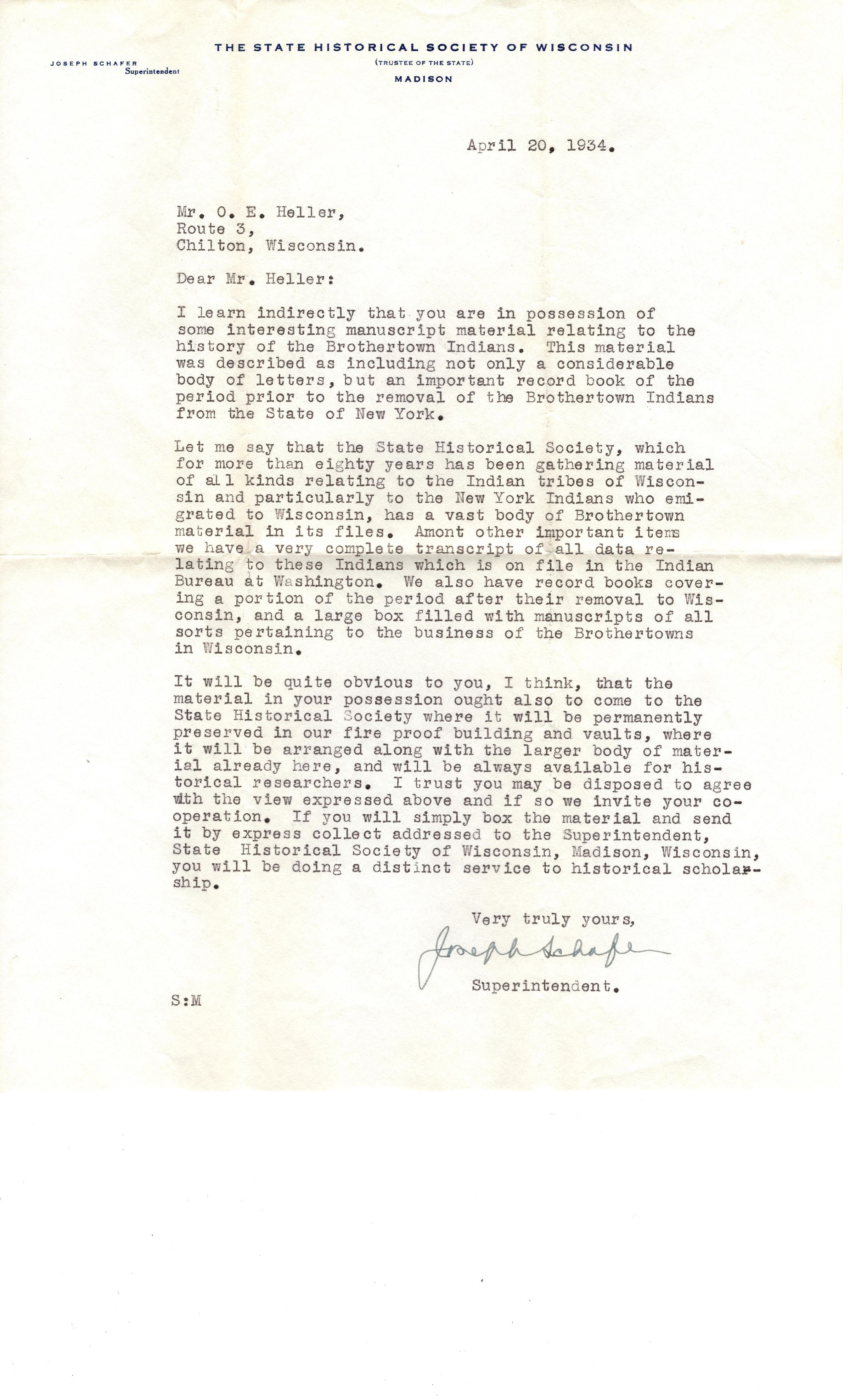 Single page, typed correspondence on The State Historical Society of Wisconsin, (Trustee of the state), Madison, Joseph Schafer, Superintendent letterhead. The letter is addressed "April 20, 1934 Mr. O.E. Heller, Route 3, Chilton, Wisconsin. Dear Mr. Heller" and requests (strongly urges) O.E. Heller leave the state historical society his collection of Brothertown articles (most likely this collection). It is signed "Very truly yours, Joseph Schafer, Superintendent".
