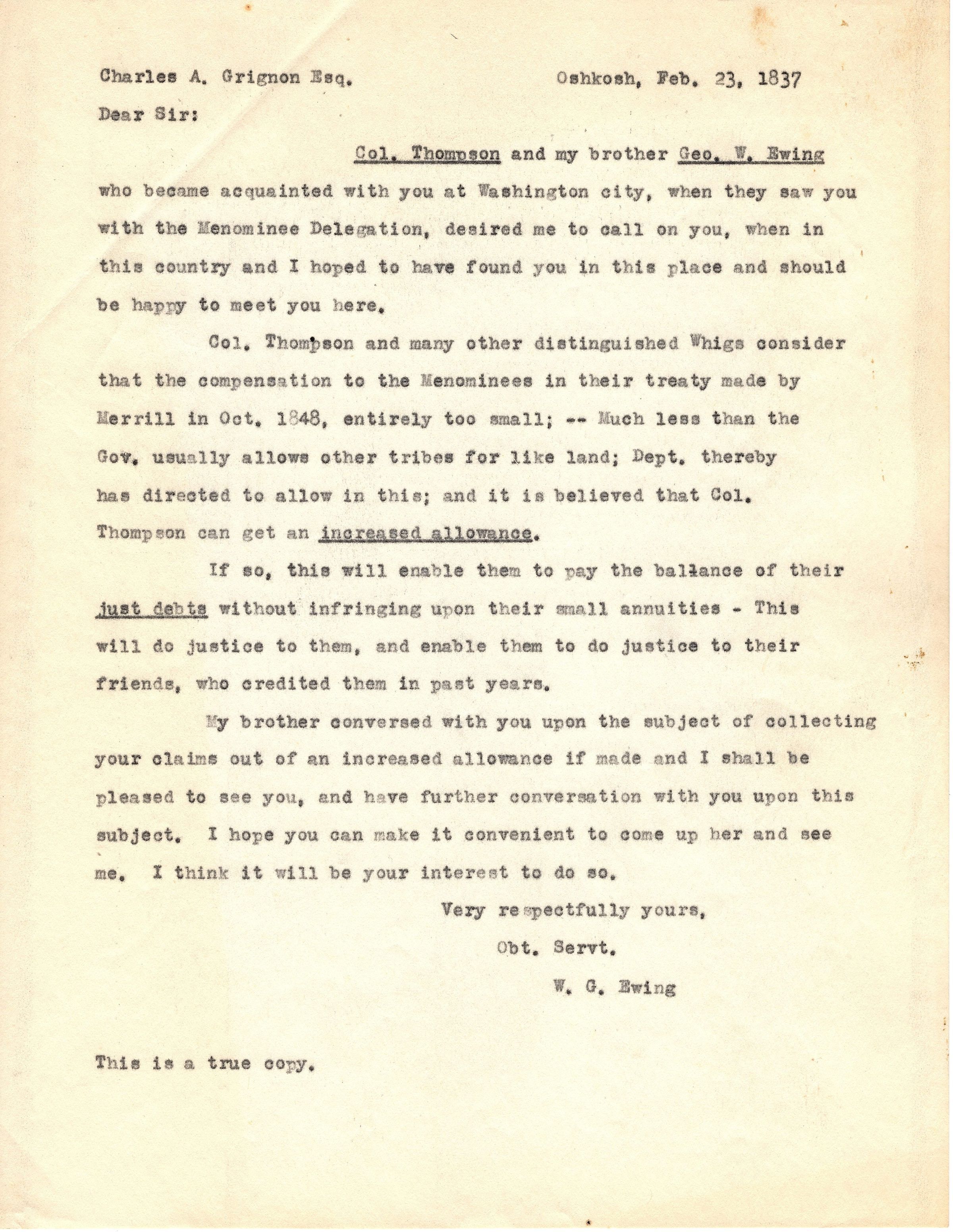 Typed correspondence on a single sheet of paper. Letter is one page only and appears to be a copy of an original. It is addressed "Charles A. Grignon Esq., Oshkosh, Feb. 23, 1837, Dear Sir". It talks about a treaty made by Merrill in Oct. 1848 being too small compared to those treaties with other tribes and requests an increased allowance for Col. Thompson so that they can pay the balance of their debts without getting into their annuities. It is signed "Very respectfully yours, Oct. Servt., W.G. Ewing".