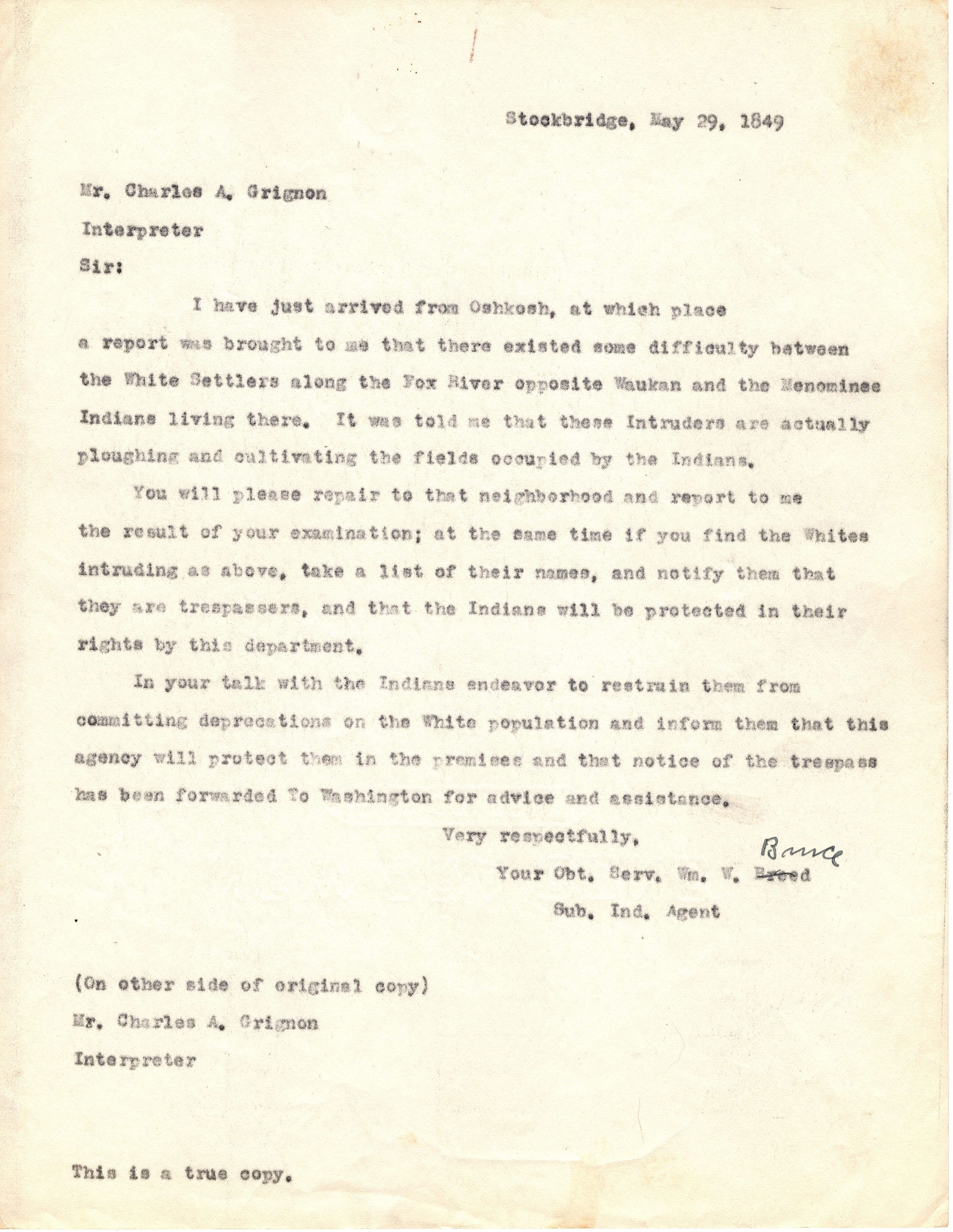 Single page, typed correspondence (copy) that is addressed "Stockbridge, May 29, 1849, Mr. Charles A. Grignon, Interpreter". Requesting Grignon to go to the Fox River and investigate the encroachment of white settlers on Menominee lands. They are trying to plough and cultivate the land which is causing issues. It asks him to "endeavor to restrain them [the Menominee] from committing deprecations on the White population and inform them that this agency will protect them in the premises and that notice of the trespass has been forwarded to Washington for advice and assistance." It is signed "Very respectfully, Your Obt. Serv., Wm. W. Breed" which is crossed out and written "Bruce" over it.Collection