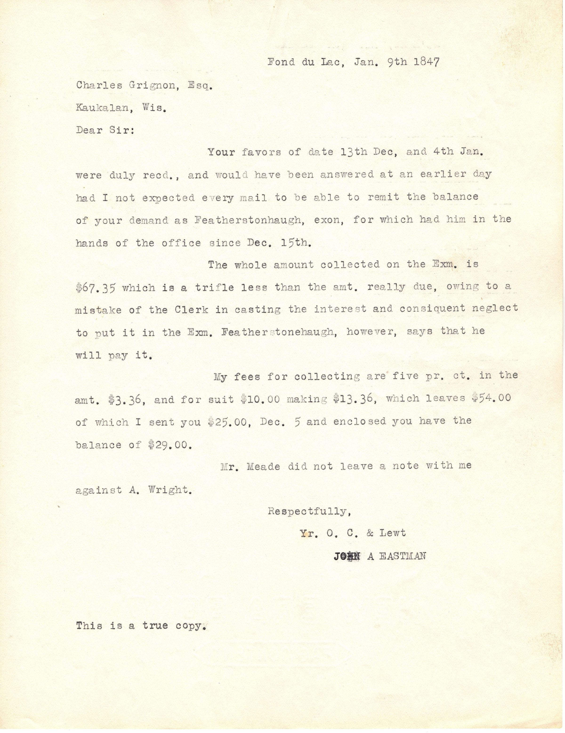 Single page, typed correspondence addressed "Fond du Lac, Jan. 9th 1847, Charles Grignon, Esq., Kaukalan, Wis., Dear Sir" and talks about fees for pursuing a debt from Featherstonhaugh. Part of the fees are enclosed. It is signed "Respectfully, Yr. O.C. & Lewt, John A. Eastman".Collection