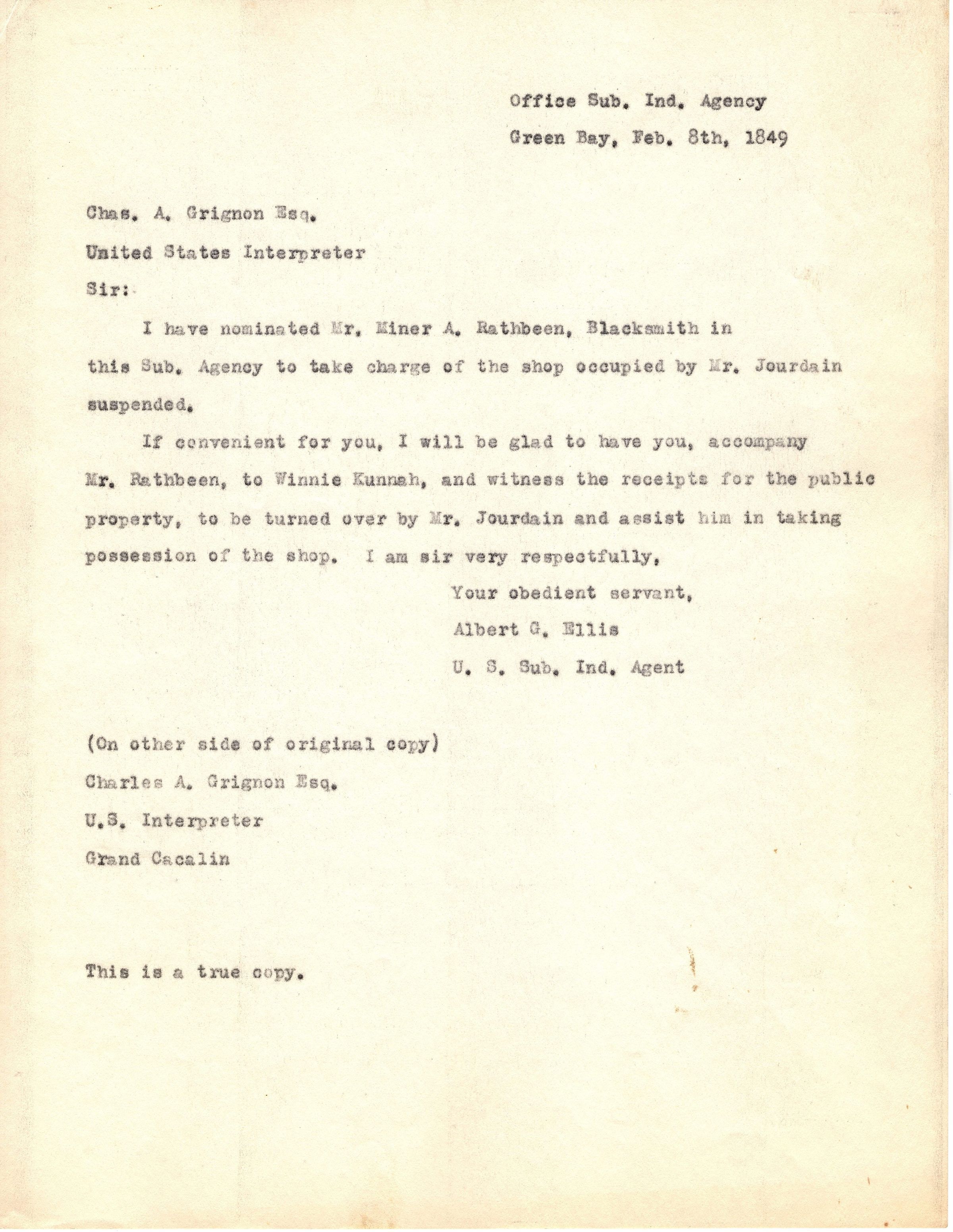 Single page, typed correspondence (copy) that is addressed "Office Sub. Ind. Agency, Green Bay, Feb. 8th, 1849, Chas. A. Grignon Esq, United States Interpreter" and talks about nominating Mr. Miner A. Rathbeen, to take charge of the shop once occupied by Mr. Jourdain.Collection