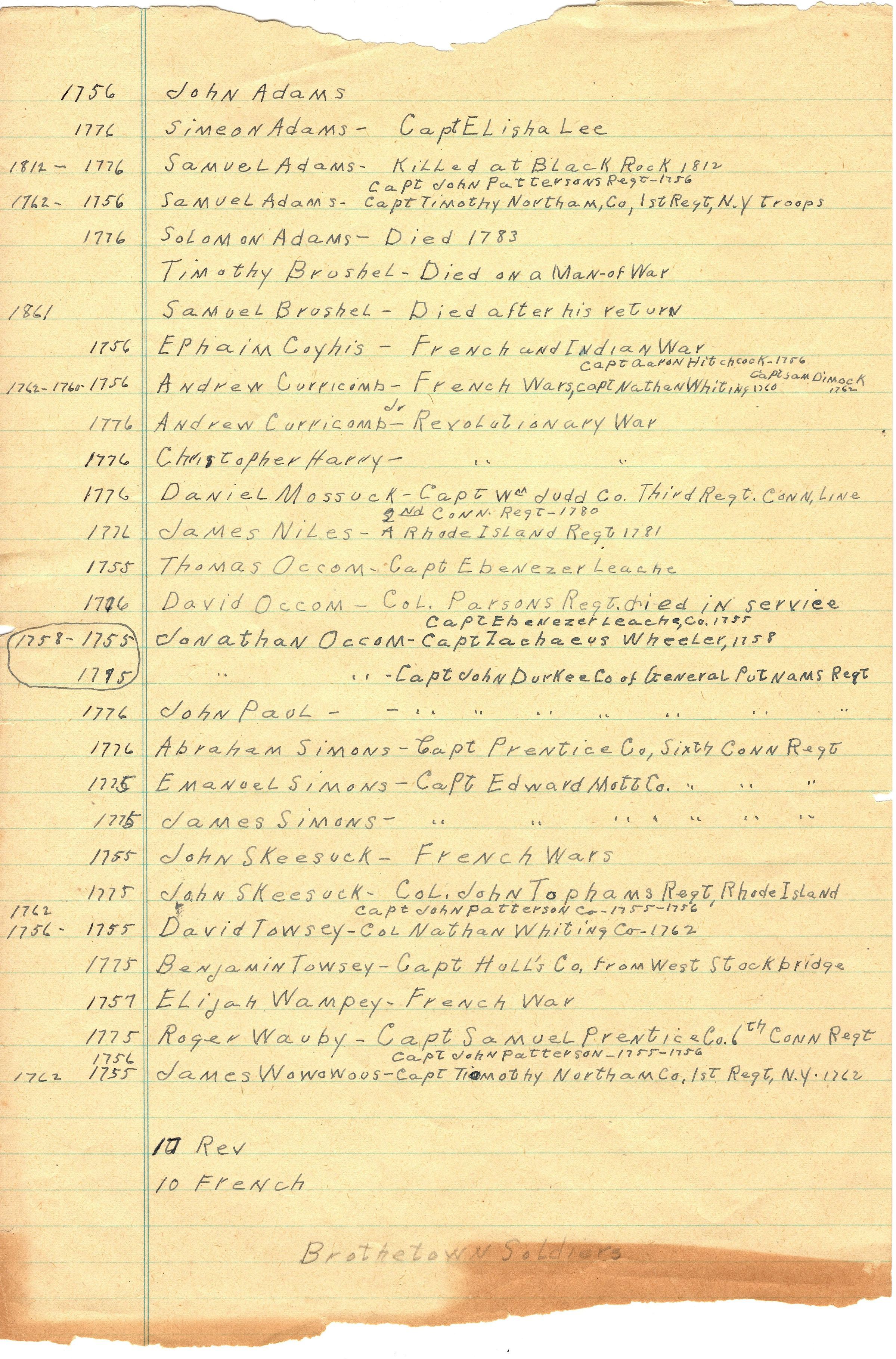 Single sheet of legal, lined paper with a list of dates and names of soldiers. Dates are all between 1756-1776. Names include: John Adams, Simeon Adams, Ephraim Coyhis, and James Wowowoos". Next to most of the names are the names of captains, wars, and death information. At the bottom written in pencil is "Brothertown Soldiers". The list seems to list 17 soldiers in the Revolutionary war and 10 in the French and Indian war.Collection