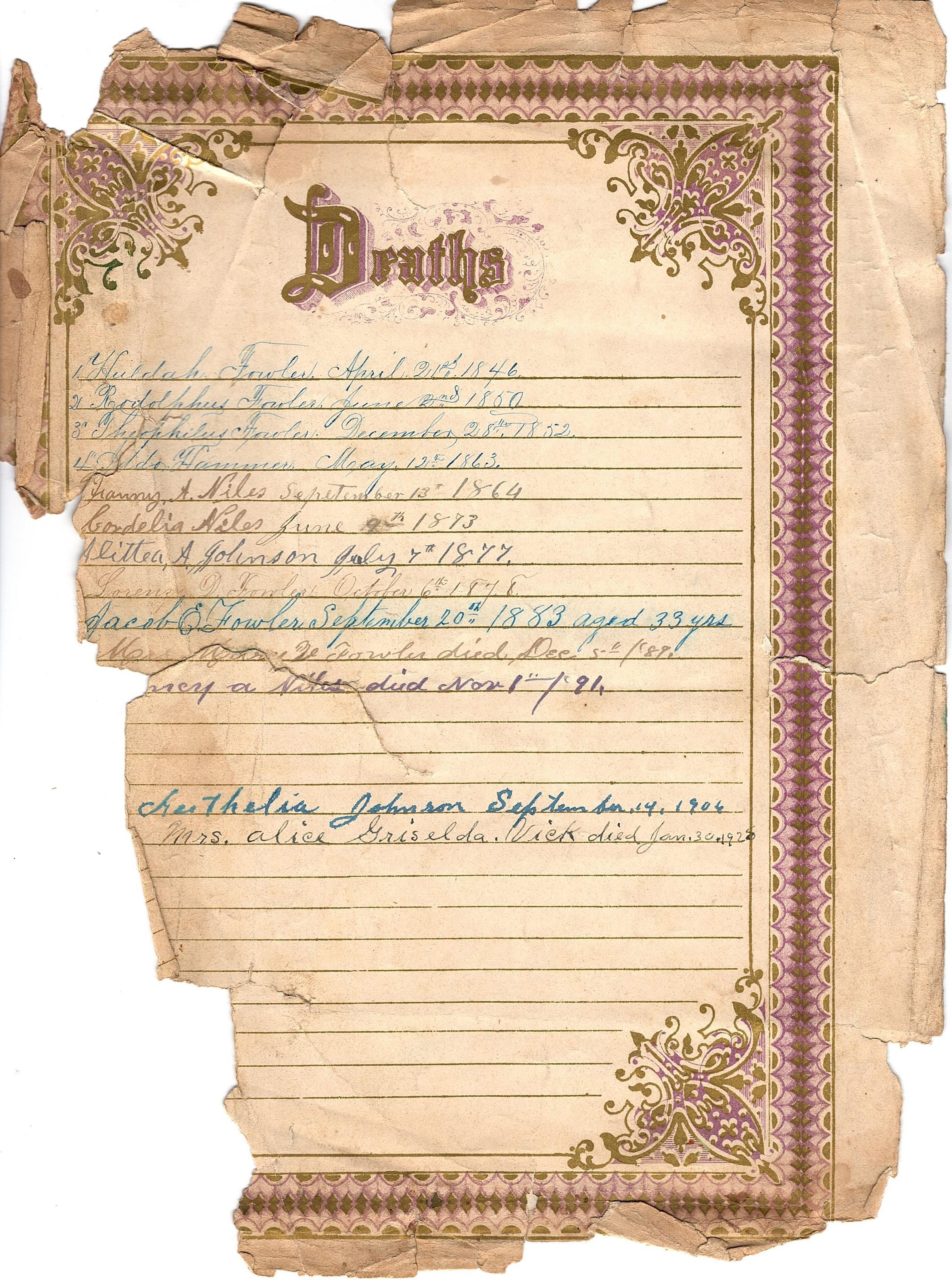 List of deaths on a single sheet of elaborately designed paper. The border is purple and gold with "Deaths" centered at the top. The list is written in mostly the same handwriting but in different inks from blue to black and even thicker inks near the bottom. The list starts with Huldah Fowler April 21st 1846 and ends with Mrs. Alic Griselda Vick died Jan. 30 1925. There are thirteen names total with Fowler, Niles, and Johnson last names, and one Hammer. The back of the page has room for a list of Births with the same decorative border, but there is no one listed.Collection