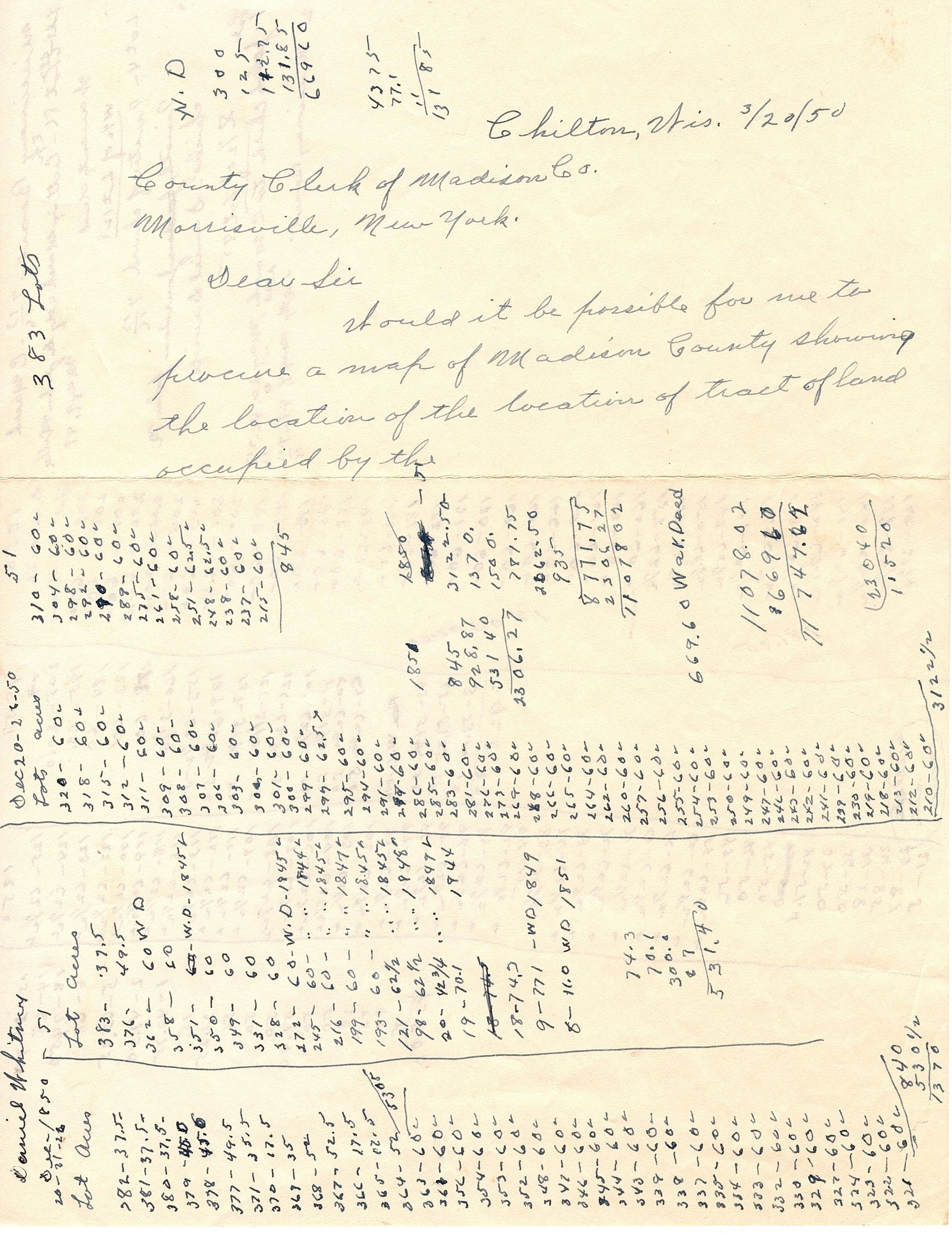 Single sheet of paper with multiple columns listing Lots and Acreage. It looks like it tracks the lots and acres through the years 1850-1851. There was the beginning of a letter to the County Clerk of Madison Co. requesting a "map of the locations of tracts of land occupied by the" and this is where it ends.Collection