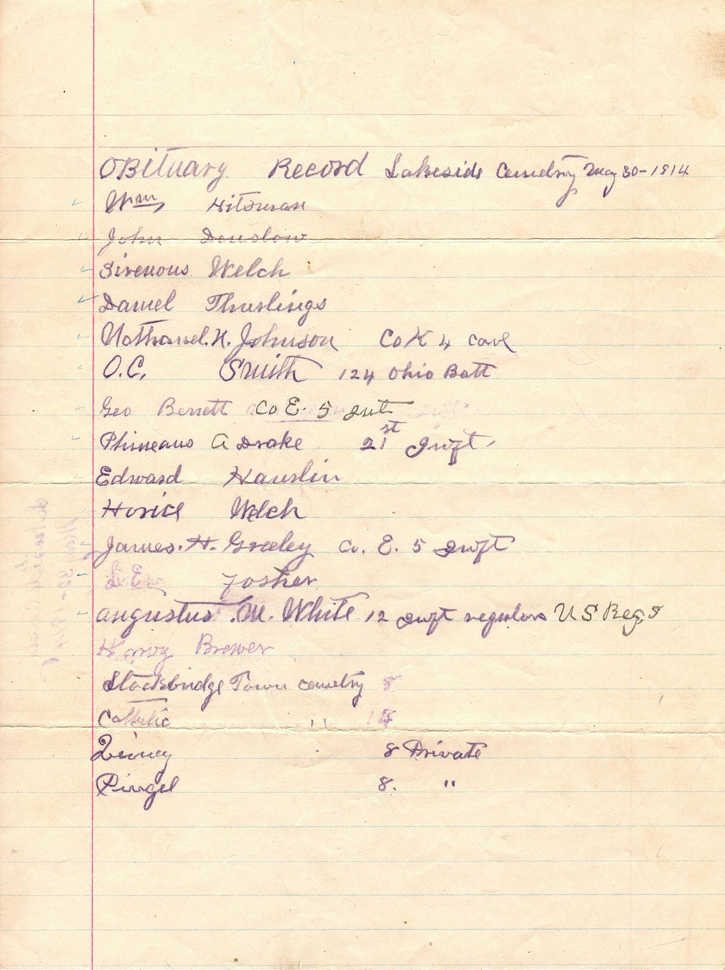 Single sheet of paper with a list of information from Lakeside Cemetery, May 30, 1914. It seems to list people in the cemetery and if they served in the military. The writing looks to be in a dark purple pencil.Collection