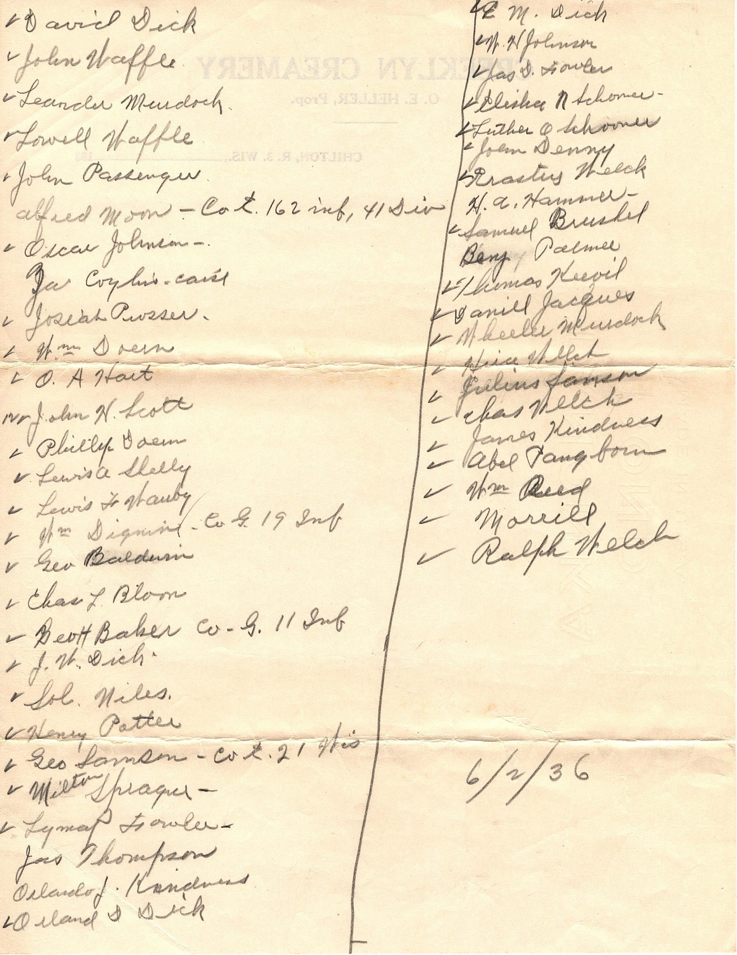List of names with check marks next to them and the date 6/2/36 written in pencil at the bottom. Names include: David Dick, John Waffle, Leander Murdoch, etc. The list is written on the back of Creeklyn Creamery letterhead paper.Collection