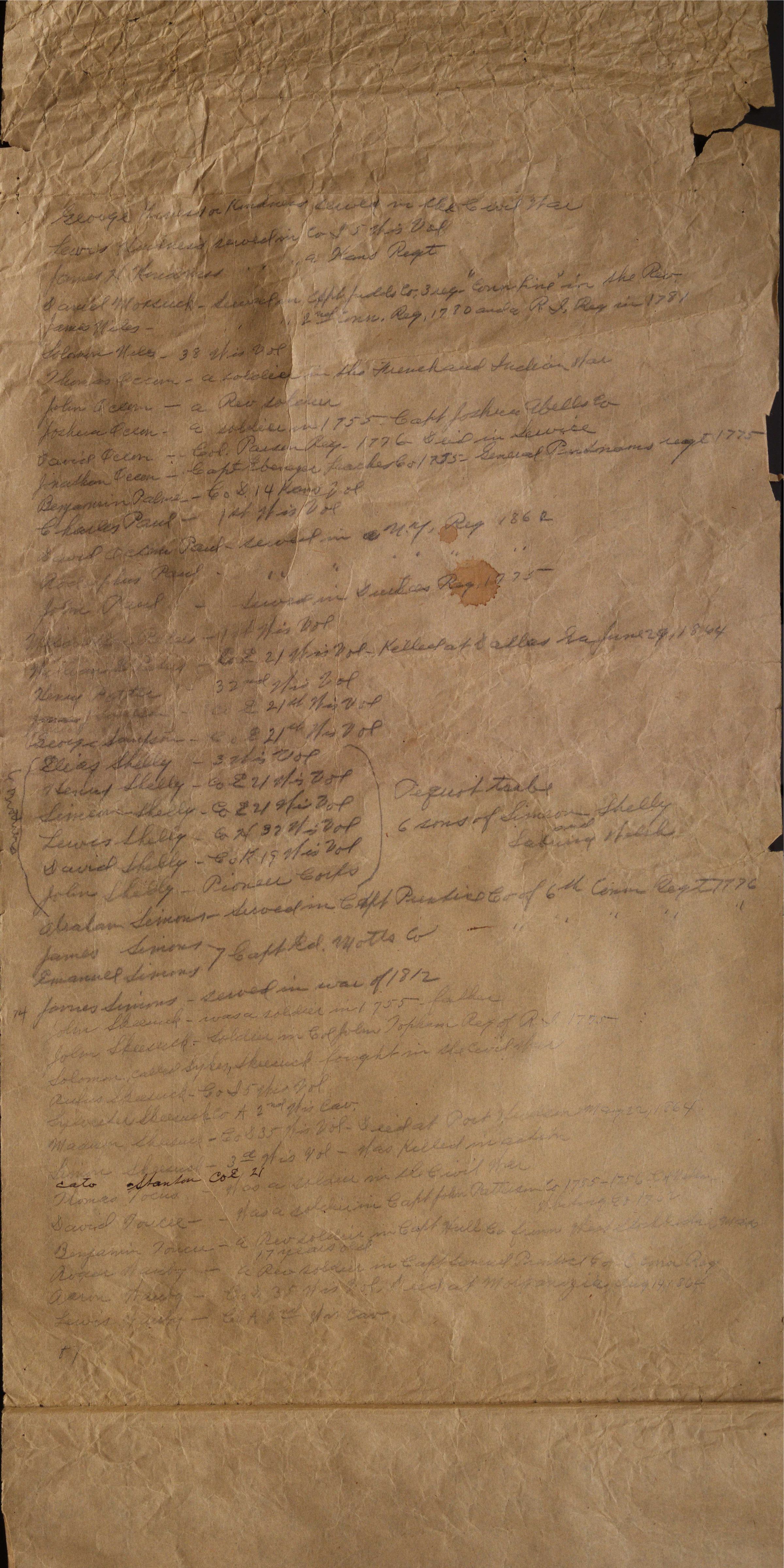 Oversized sheet of paper (used for thin paper bags) with a list of soldiers. The list is written in pencil except for one note under Simon Skeesuck seven names from the bottom. In the middle there is a list of six names bracketed because they belong to the Pequot tribes and are the 6 sons of Simon Shelly and Sabrina Welch.Collection