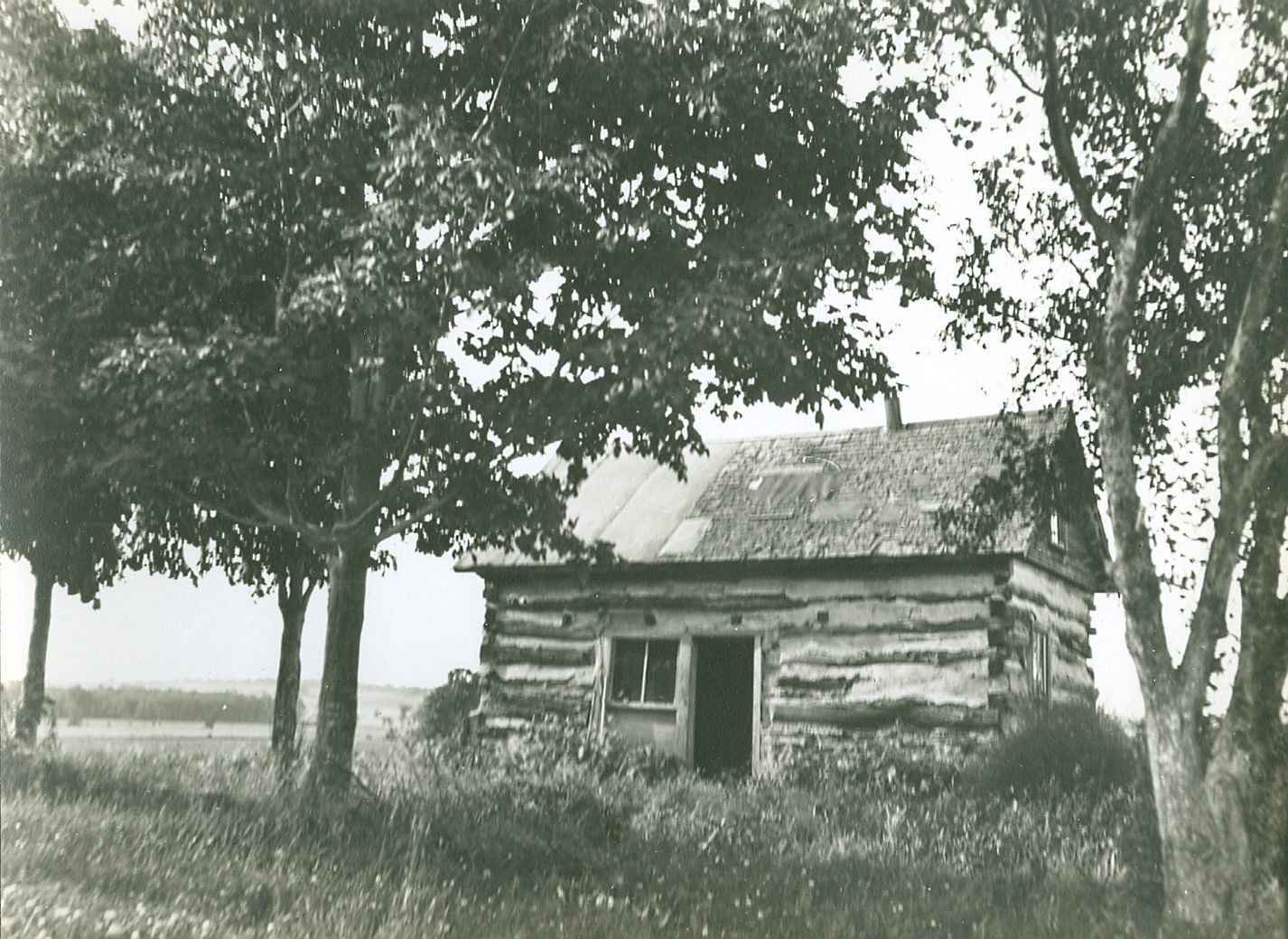 Black and white photograph of a small log cabin nestled in trees. The door of the cabin is open or missing and there is a small window to the left of the door. There is one smoke stack chimney on the roof.Collection