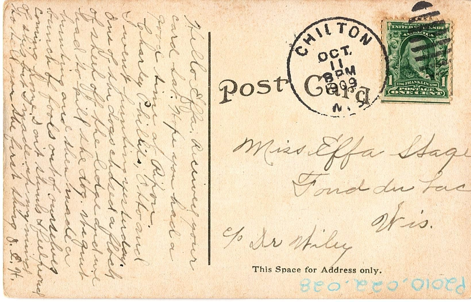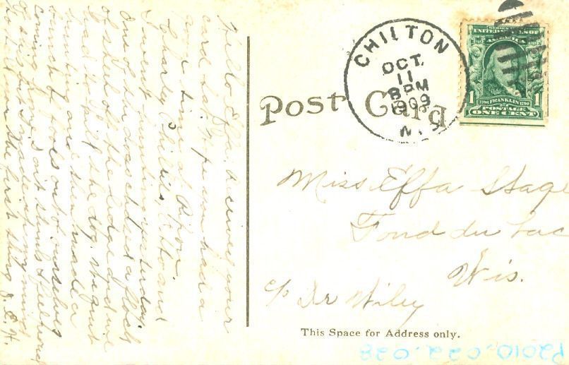 photo). One cent Franklin stamp and a Chilton, Wis, Oct. 11 1909 8PM stamp.Collection