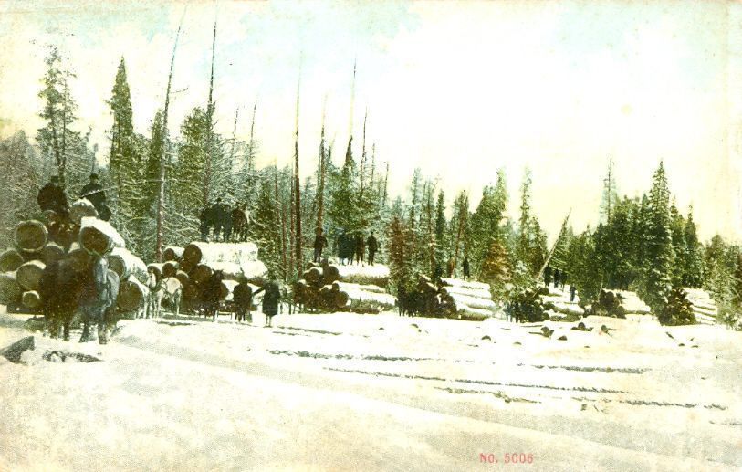 Colorized black and white photo of a logging operation. Seven large piles of logs with numerous men standing on and by