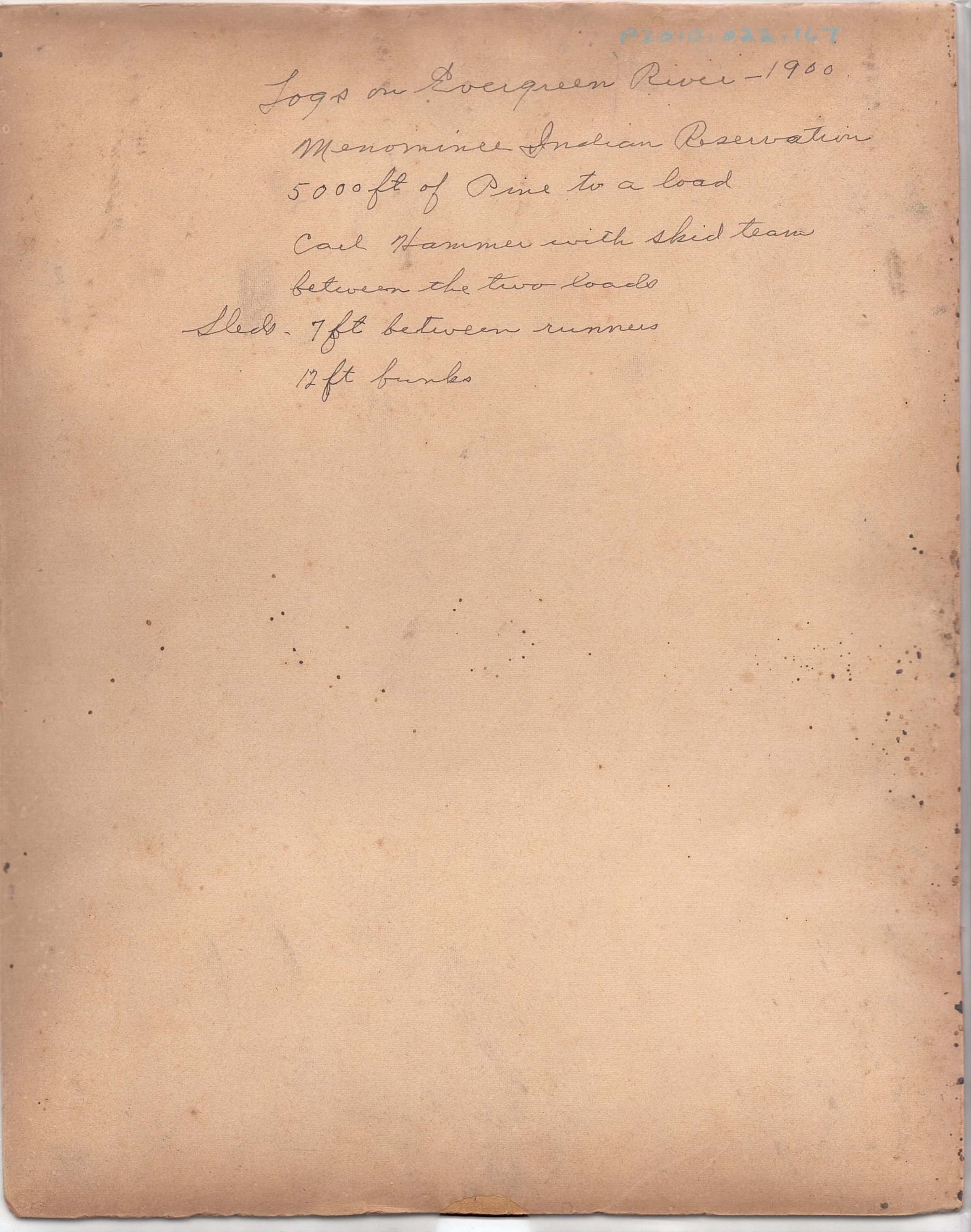 "Logs on Evergreen River-1900. Menominee Indian Reservation. 5000ft of Pine to a load. Carl Hammer with skid team between the two loads. Sled-7ft between runners, 12 ft bunks."Location