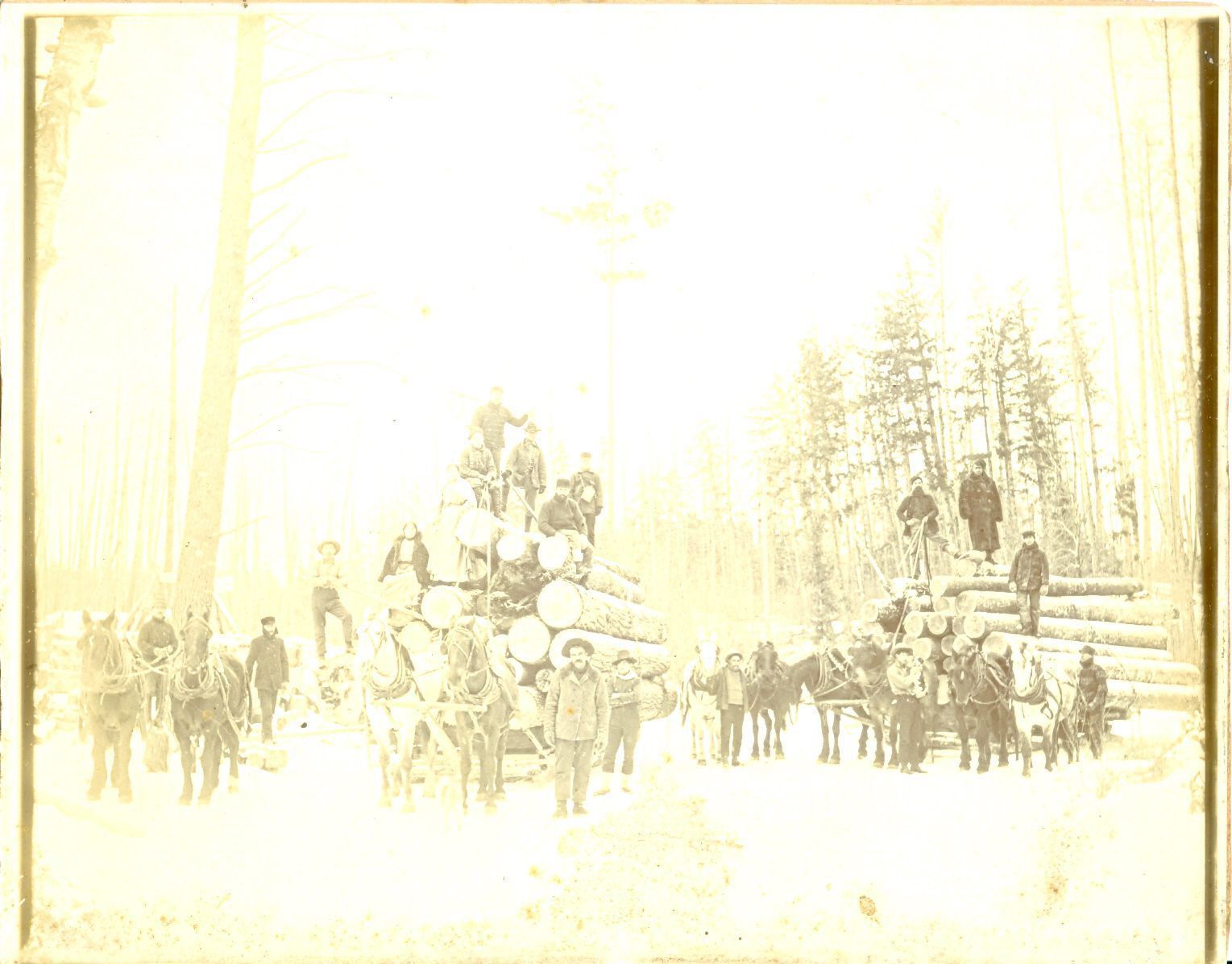 Black and white photograph of a logging crew. There are two large piles of logs being pulled by horses. Two horses stand to the left with two men behind them. In the middle pulling one of the log piles are two horses and eight people sit/stand on top of the logs with two standing to the side. There is a man between the two log piles holding two horses by the reigns. There are four more horses in front of the second log pile with two men standing near them, one is holding a puppy, and three men standing on top of the log pile. There are in a wooded area.