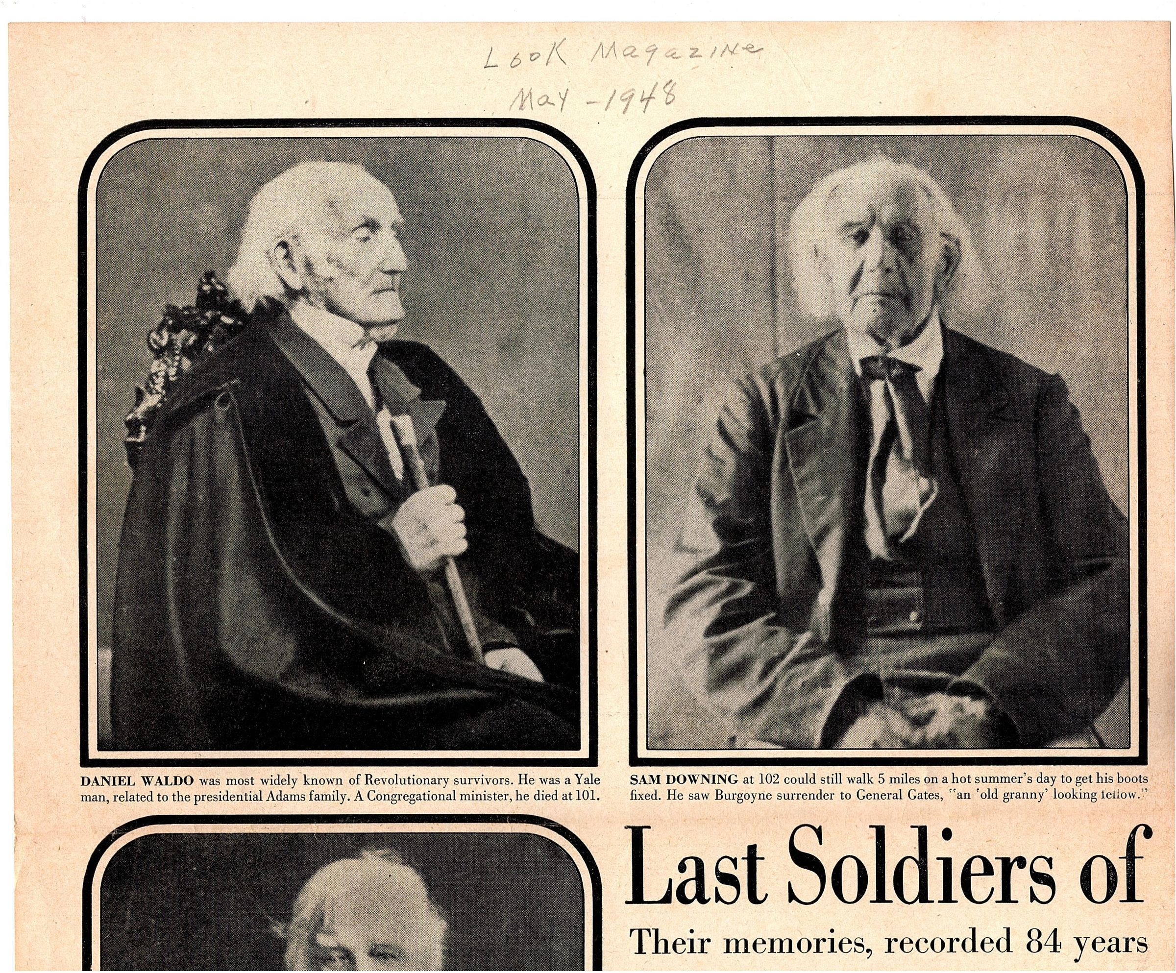 Four pieces from "Look Magazine" from May 1948. The article that was cut from the magazine is titled "Last Soldiers of the Revolution: Their Memories, recorded 84 years ago, illuminate early days of the U.S." written by Archibald MacLeish. There are large images of the soldiers around the first two pages of the article. The last two pages are only partial pages cut for the content.Collection