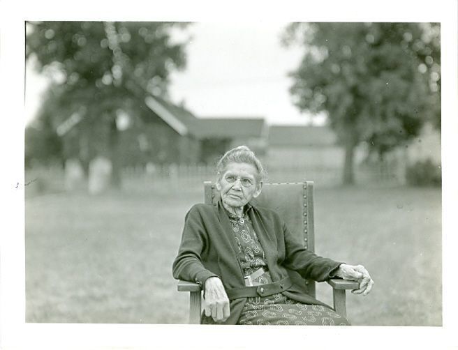 Two black and white photographs, not identical, but leaving the number system. BC2010.022.063A is of an elderly woman sitting in a wood chair with a fabric backing held on by metal pegs. She is outside in a grassy field with a large building (blurry) in the background with what could be a white picket fence. She is wearing a patterned dress with light circles, a belt, and a sweater. She wears glasses and her arms are resting on each arm of the chair. She is looking slightly to her right, left in photograph. The second photo, BC2010.022.063B appears to be a closeup of her fast as she looks to the right of the camera.