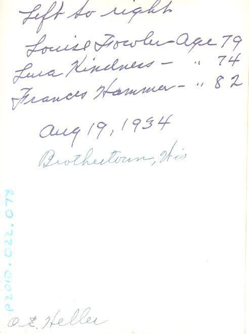 "Left to right, Louise Fowler Age 79, Lera? Kindness age 74, Frances Hammer age 82, Aug 19, 1934". Written in different ink "Brothertown, Wis." and in the bottom corner "O.E. Heller"Location