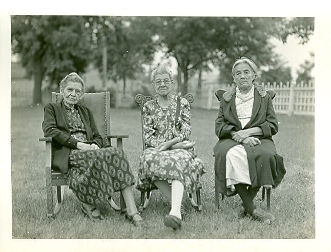 Written in black ink on the back "Left to right, Louise Fowler Age 79, Lera? Kindness age 74, Frances Hammer age 82,