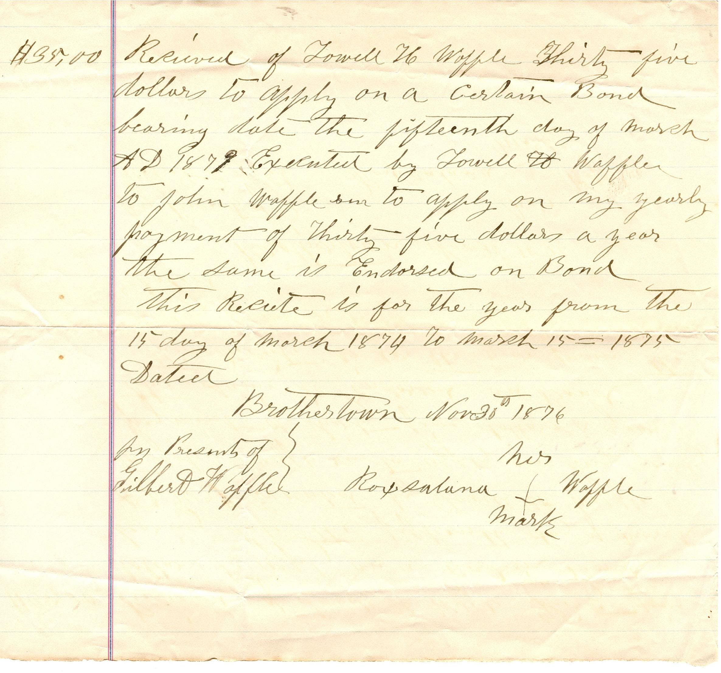 Half a sheet of lined paper with a red-blue-red lined border down the left side. The paper is a receipt written in black ink that reads "$35,00 Received of Lowell H Waffle thirty five dollars to apply on a certain Bond bearing date the fifteenth day of March AD 1879. Executed by Lowell H Waffle to John Waffle Sn to apply on my yearly payment of thirty five dollars a year the same is endorsed on Bond this reciete [sic] is for the year from the 15 day of March 1874 to March 15 1875 Dated, Brothertown Nov 30 1876. In presents [sic] of Gilbert Waffle." Roxsalana Waffle marked an x between her first and last names on the paper.Collection