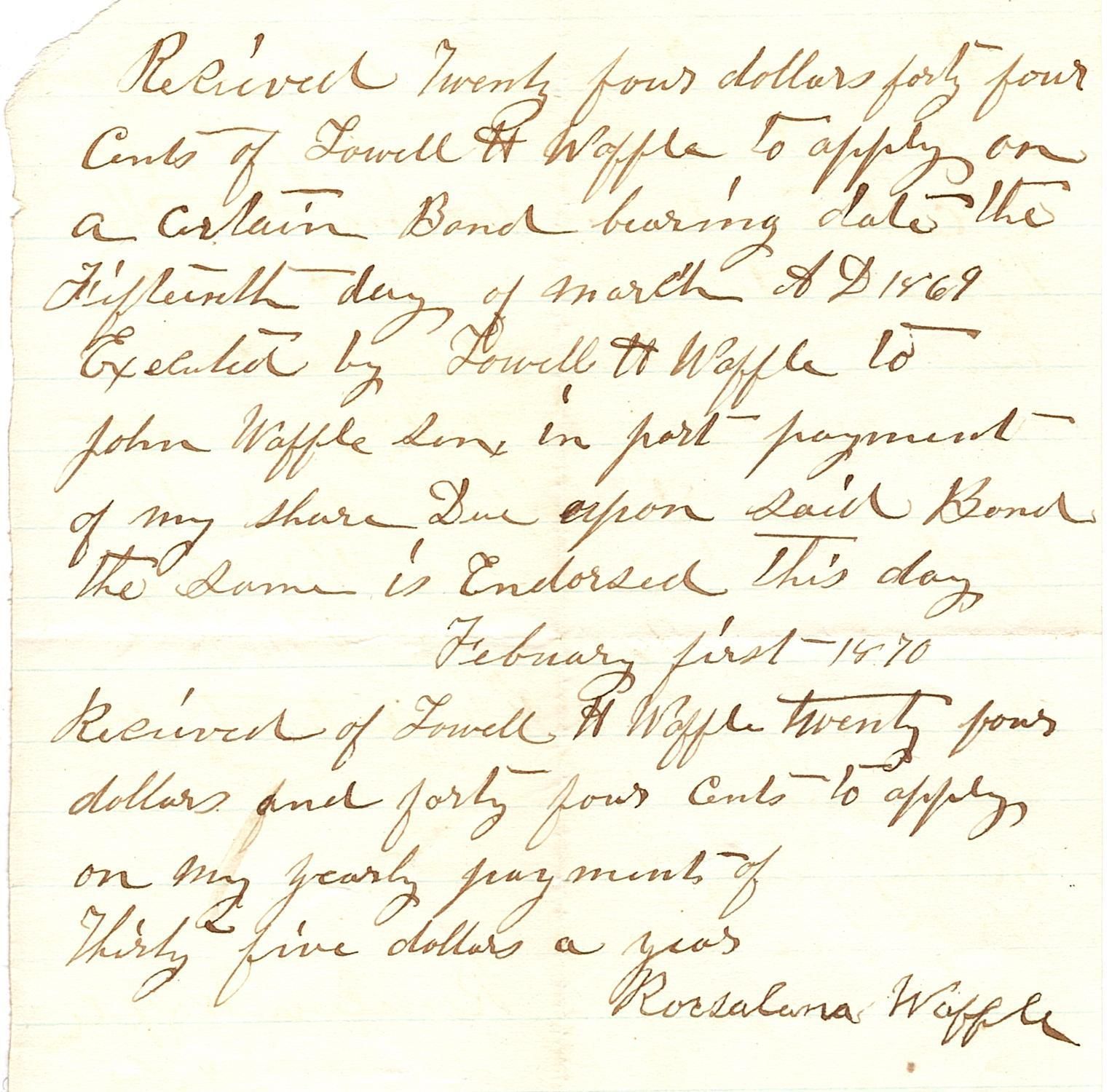 Notepad sized lined paper with writing in black ink that reads "Received twenty four dollars forty four cents of Lowell H Waffle to apply on a certain Bond bearing date the fifteenth day of March AD 1869. Executed by Lowell H Waffle to John Waffle Sn in part payment of my share due upon said Bond the same is endorsed this day. February first 1870. Received of Lowell H Waffle twenty four dollars and forty four cents to apply on my yearly payments of thirty five dollars a year. Roxsalana Waffle."Collection