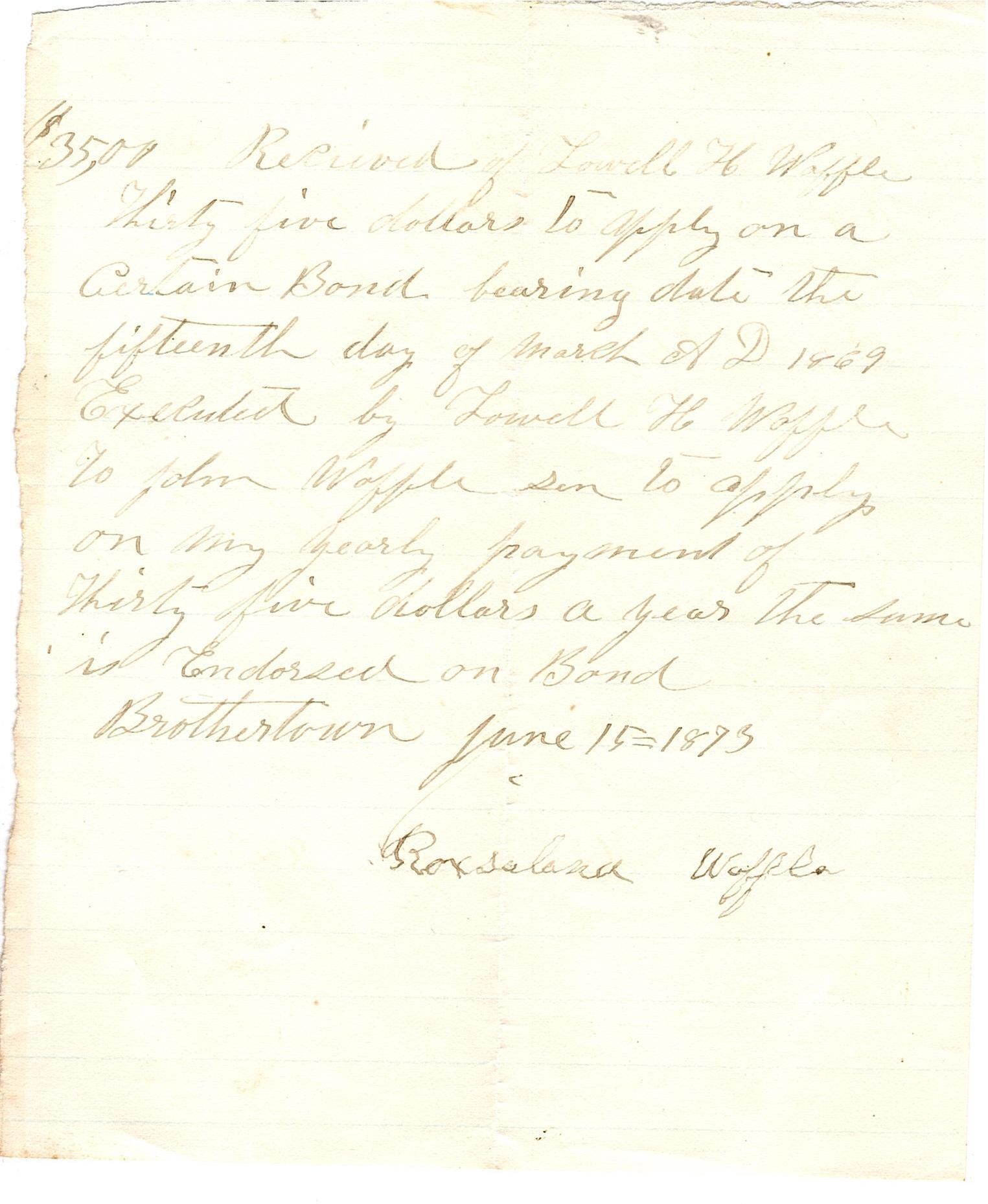 Partial sheet of lined paper with black writing that reads "$35,00 Received of Lowell H Waffle thirty five dollars to apply on a certain Bond bearing date the fifteenth day of March AD 1869. Executed by Lowell H Waffle to John Waffle Sn to apply on my yearly payment of thirty five dollars a year the sum is endorsed on Bond. Brothertown June 15 1873, Roxsalana Waffle."Collection