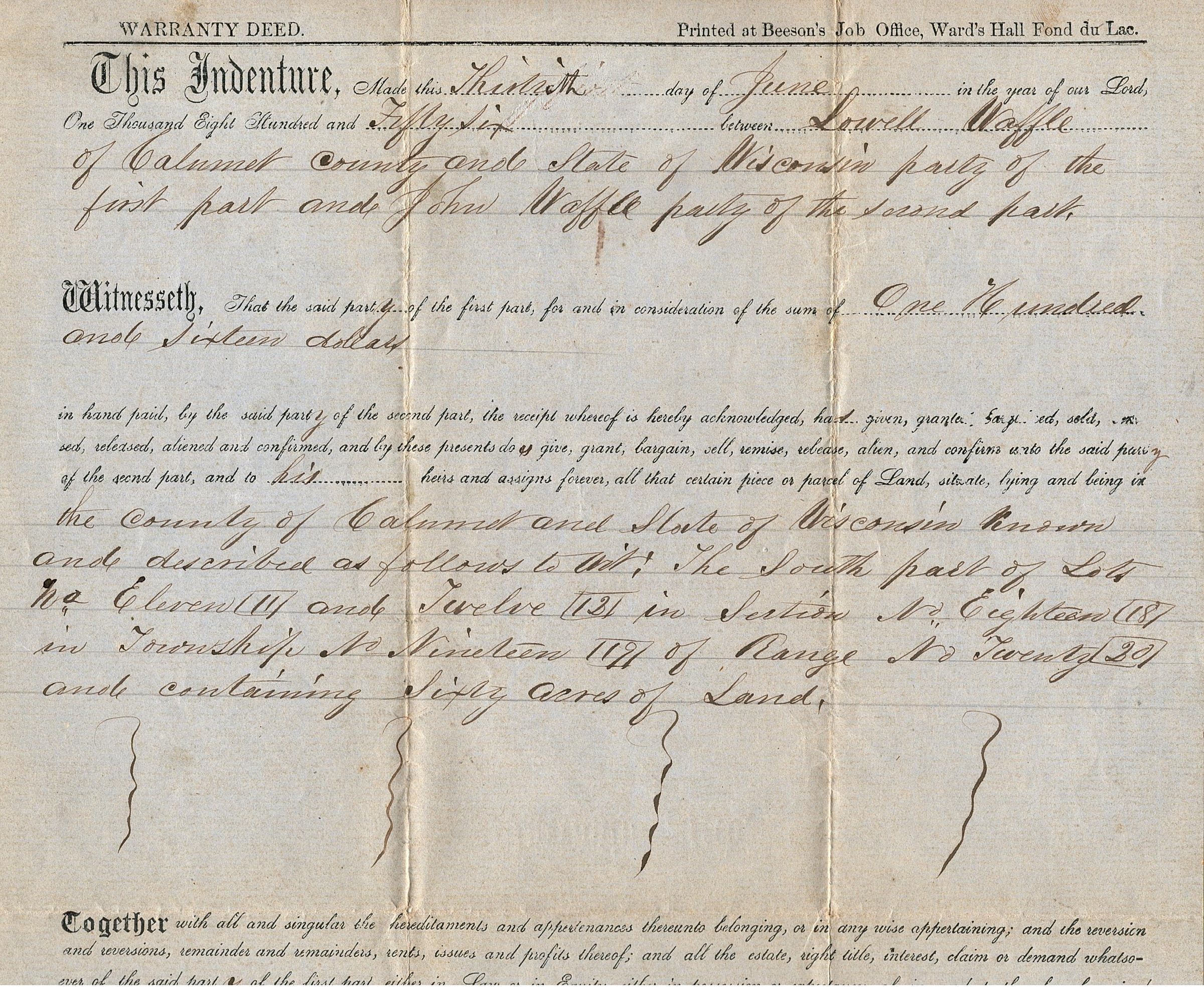 Oversized official document-warranty deed. Lowell Waffle to John Waffle. Register's Office, Calumet County, Wisconsin. Received for Record July 4th, 1856. The deed is on a thick gray paper "Printed at Beeson's Job Office, Ward's Hall Fond du Lac." There different between this one and the next one with the same people and date is that this one has four squiggly lines straight down from the written paragraph at the top to the middle line (lot might be different as well).Collection