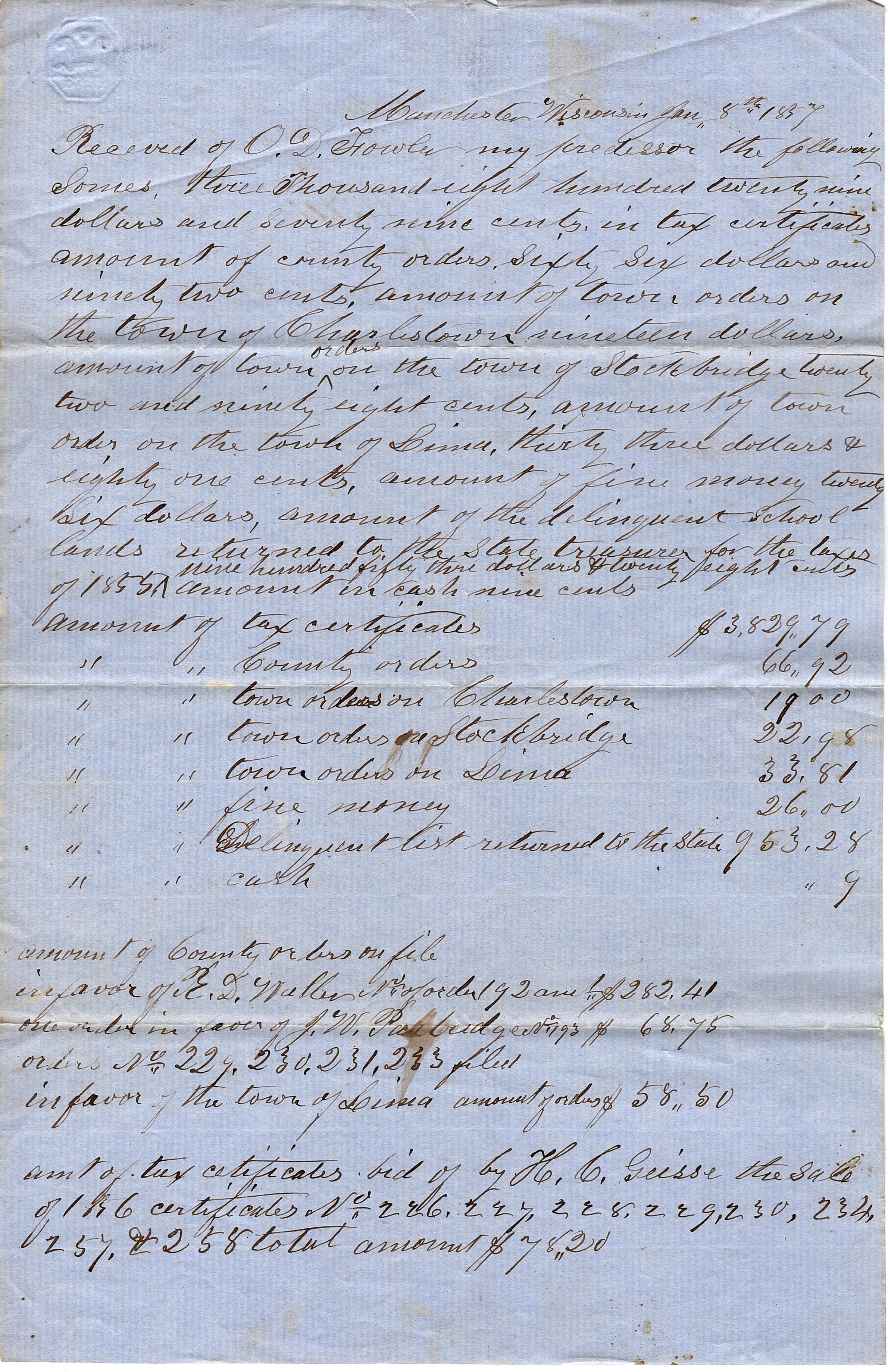 Oversized official document-warranty deed. Lowell Waffle to John Waffle. Register's Office, Calumet County, Wisconsin. Received for Record, July 4th, 1856. The form is on a thicker gray paper "Printed at Beeson's Job Office, Ward's Hall Fond du Lac."Collection
