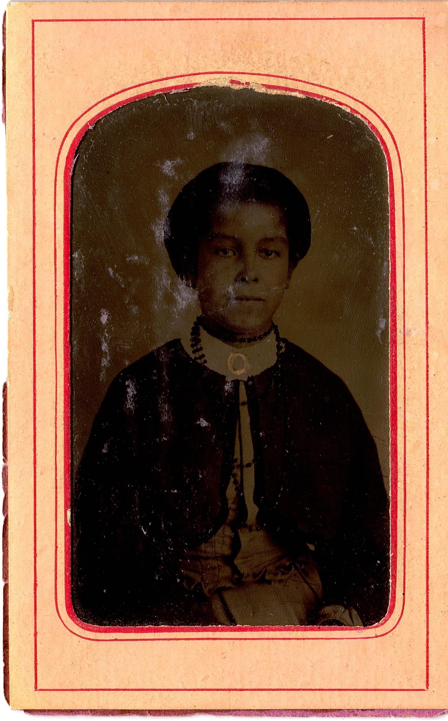 Tintype of a young girl wearing a button up sweater with a light decorative line along the buttons. She has a light colored collar on and a necklace. Her skirt is lighter in color and her hair is pulled back. The tintype is glued to a pink piece of paper with a red lined border. It has a purple construction paper back. It was in an envelope that reads "Lydia Miles, Married Sam Johnson, pictures of her, #70". This is most likely O.E. Heller's organization system.Photograph Details