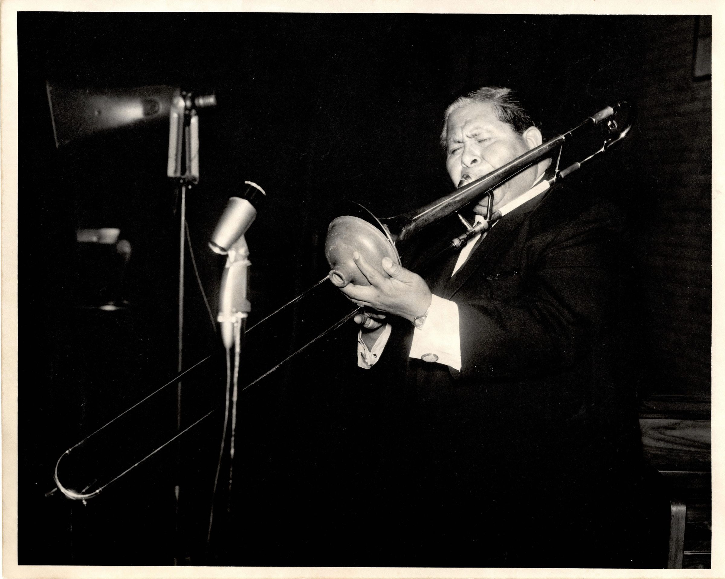 Black and white photograph of a man playing the trombone in front of a microphone. He is using a mute with his left hand.Collection