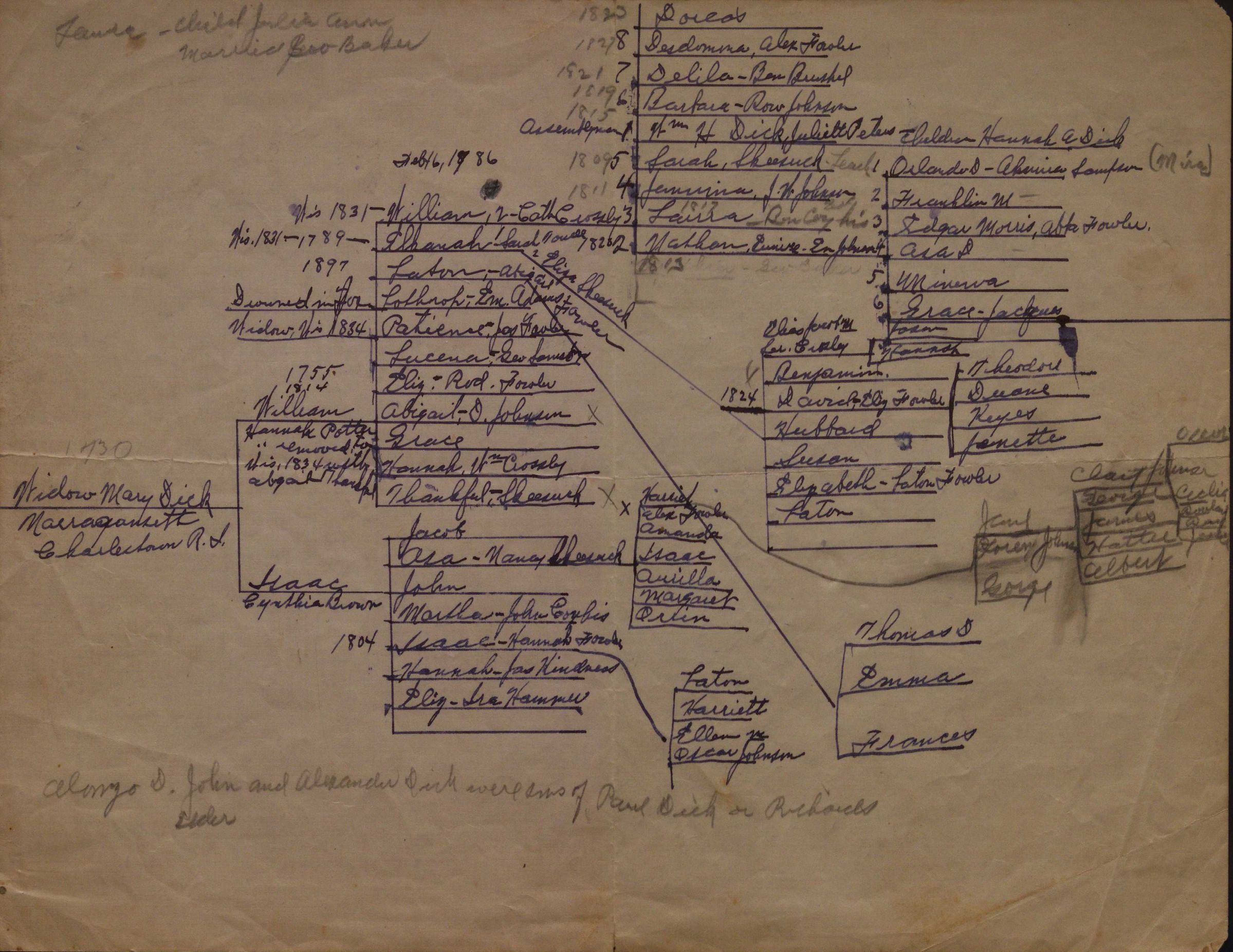 Family tree of "widow Mary Dick, Marragansett, Charlestown N.J." It goes through at least 5 generations but gets messy along the right edge. The tree is handwritten in black ink with pencil sections added. On the back is a list of names starting with Jemma Dick.Collection