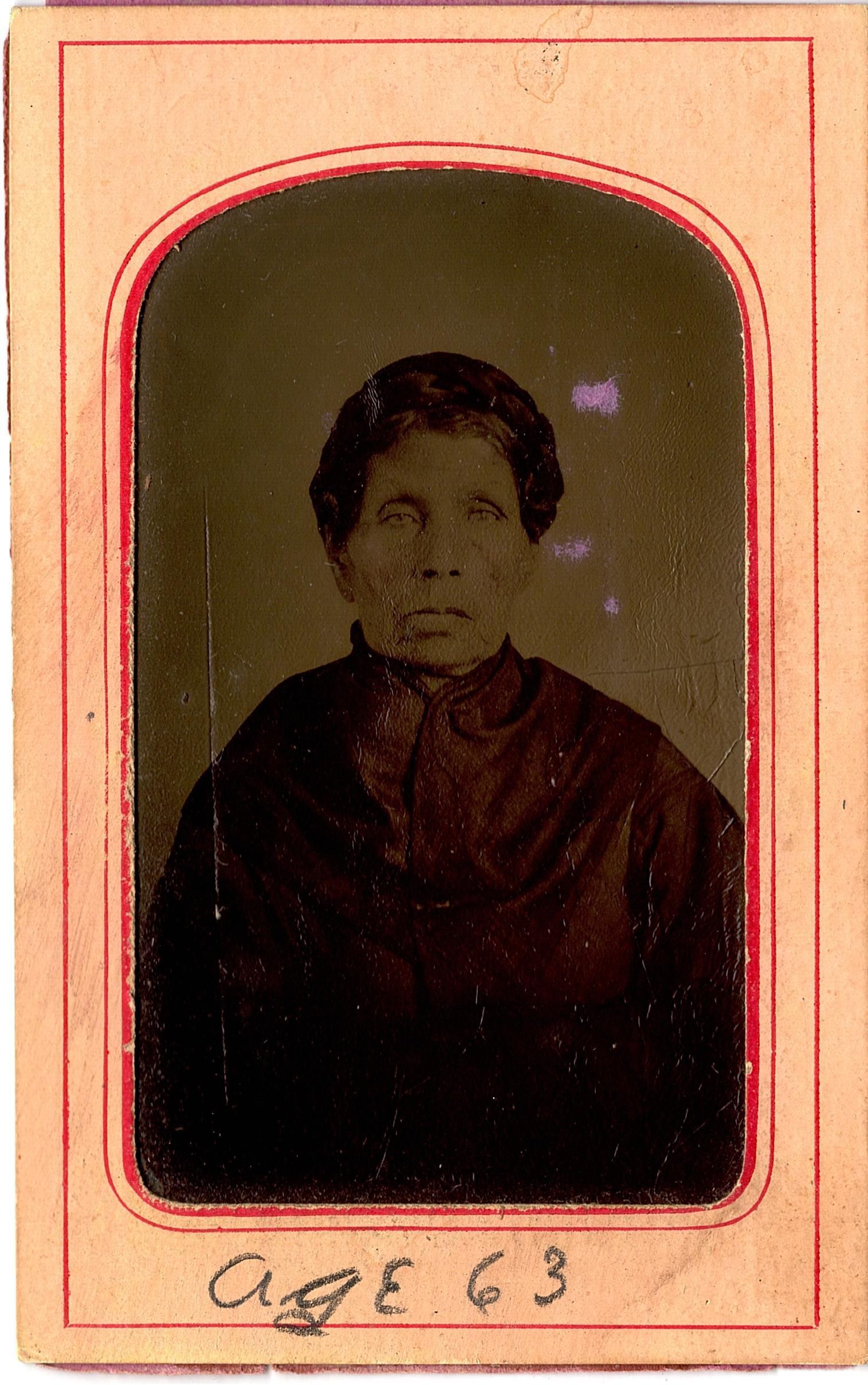 Tintype of an older woman wearing a dark long sleeve blouse/dress with a high neck. Her hair is pulled back. The tintype is glued to a pinkish colored paper with red lined borders. Under the tintype on the paper in pencil is "age 63". The back is glued to a piece of purple construction paper. The tintype came in an envelope that reads "Mary V. Johnson, married Lorenzo D. Fowler, #55". This is most likely O.E. Heller's organization system.