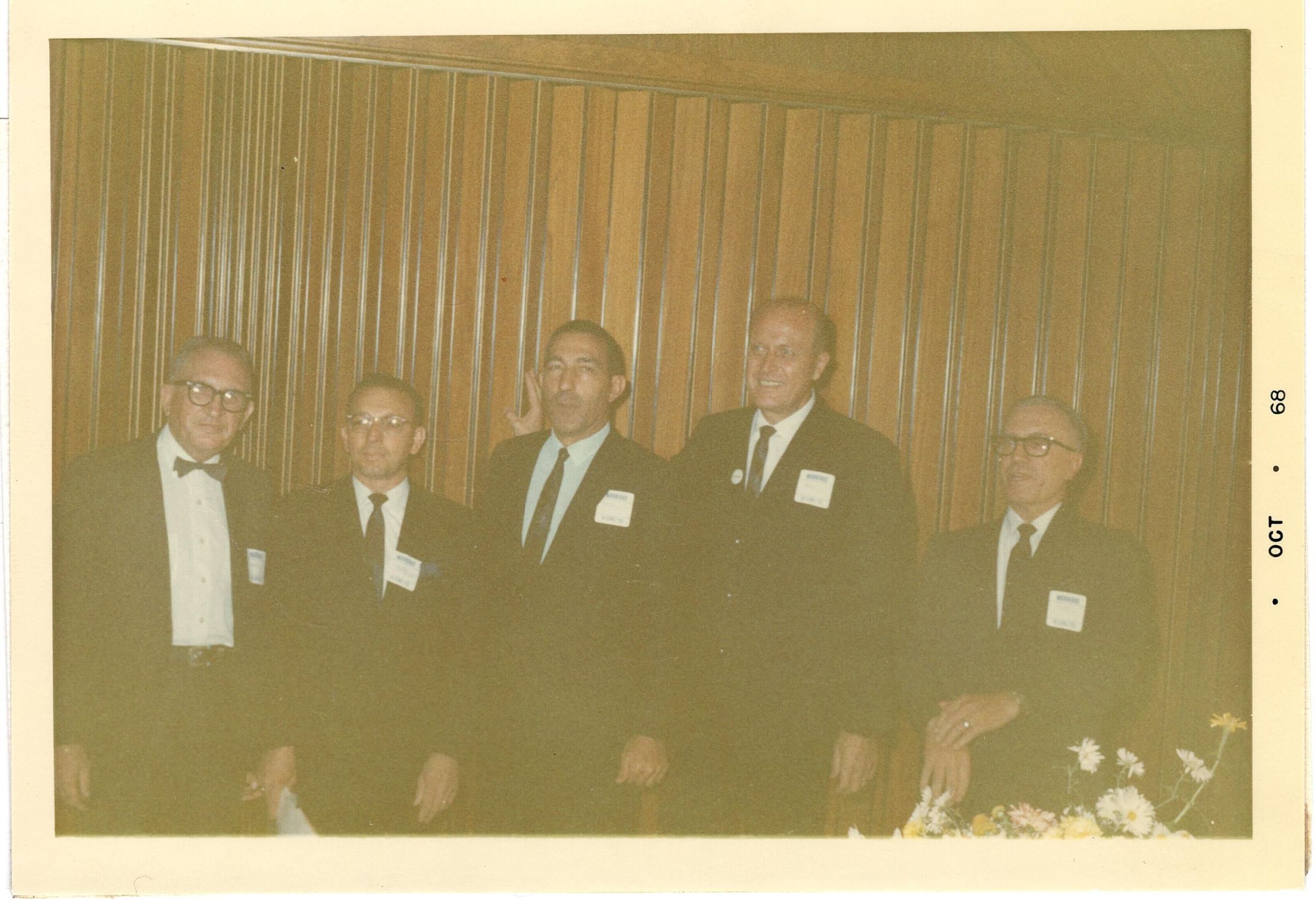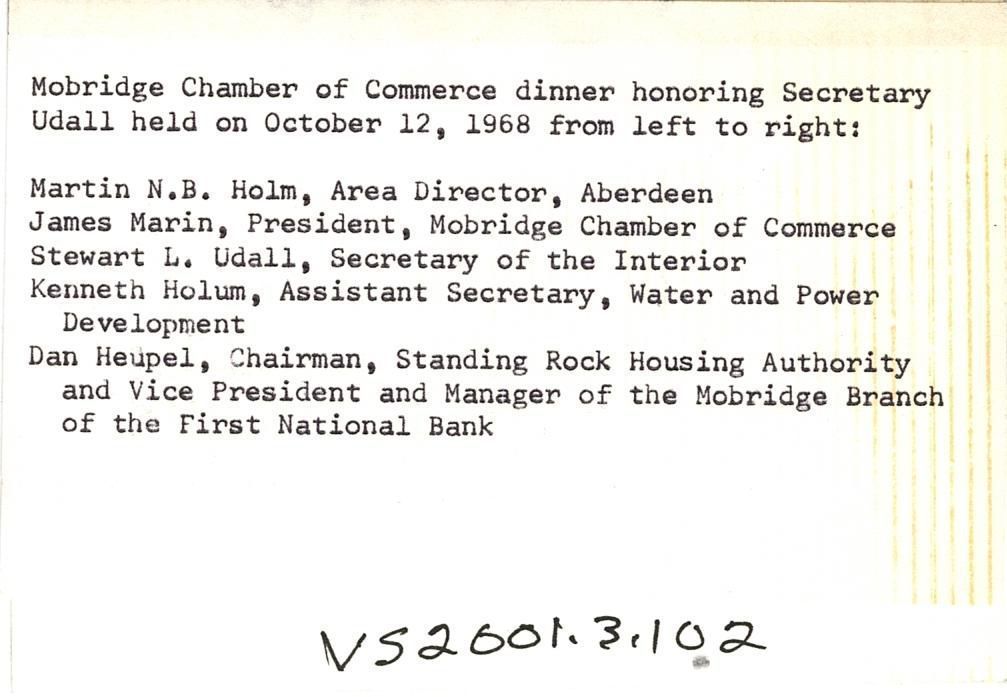 Colored photo of five men standing shoulder to shoulder in front of a retractable accordion wood panel. Typed on the back "Mobridge Chamber of Commerce dinner honoring Secretary Udall held on October 12, 1968 from left to right: Martin N.B. Holm, Area Director, Aberdeen; James Marin, President, Mobridge Chamber of Commerce; Stewart L. Udall, Secretary of the Interior; Kenneth Holum, Assistant Secretary, Water and Power Development; Dan Heupel, Chairman, Standing Rock Housing Authority and Vice President and Manager of the Mobridge Branch of the First National Bank."Photograph Details