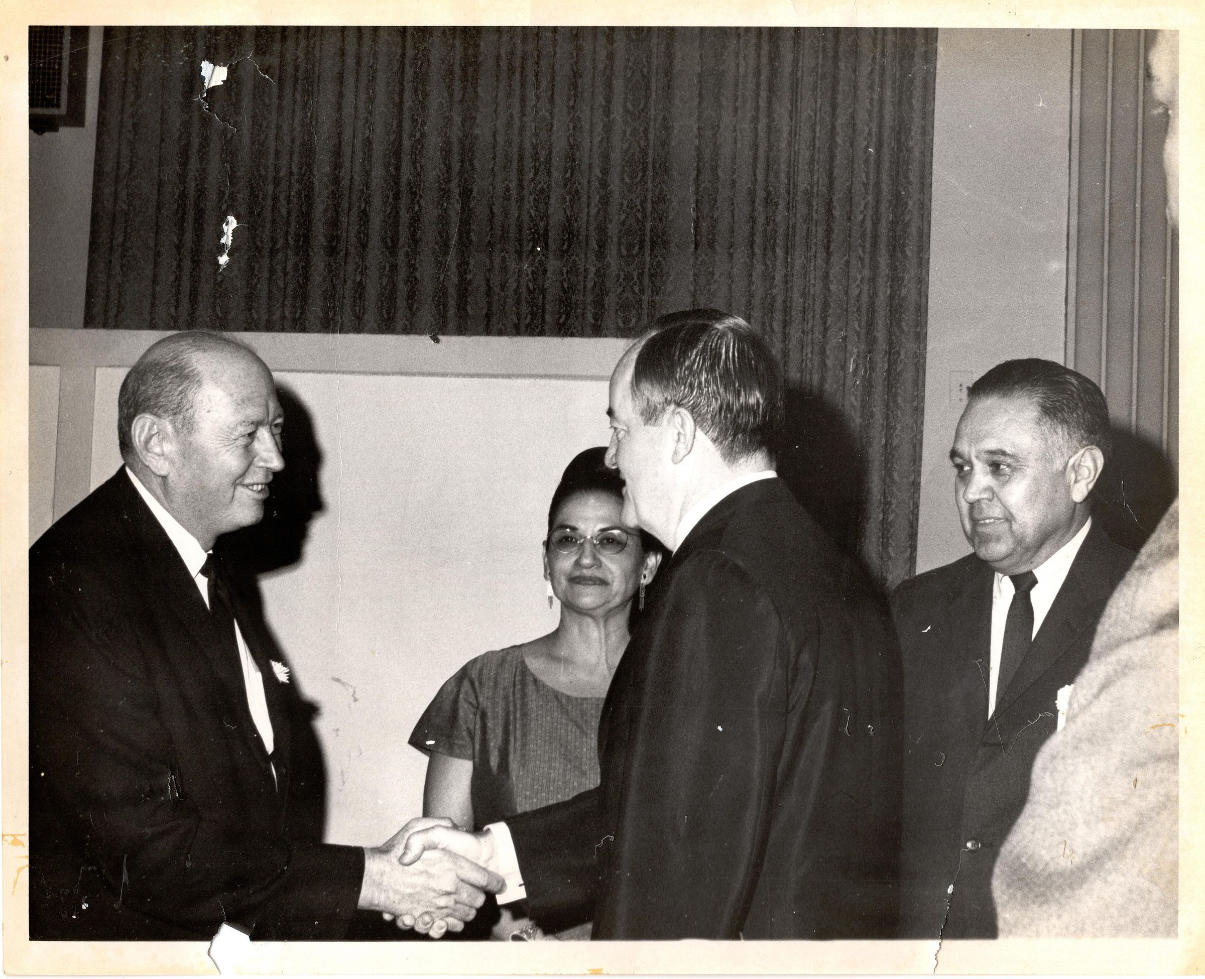 Black and white photograph of two men shaking hands. Behind them stand a woman and Robert Bennett looking on.Collection
