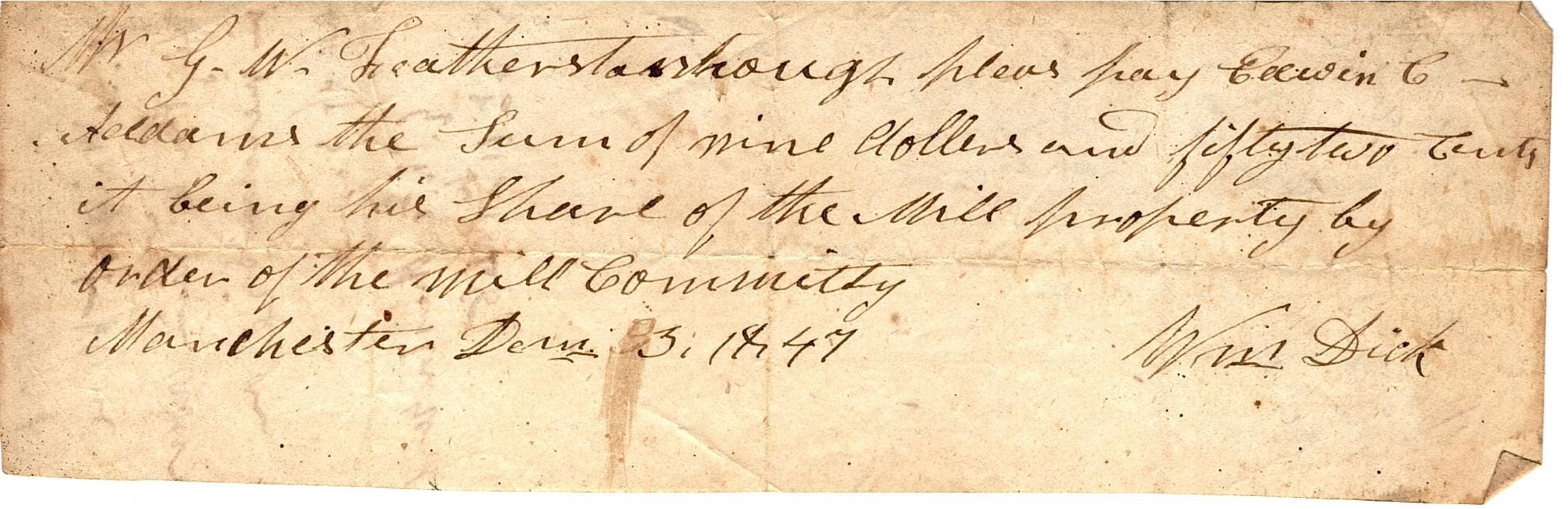 Small sheet of paper with writing in black ink that is a note for the sum of nine dollars and fifty two centers for a share of the mill property, dated Dec 3 1847 and signed by -- Dick, but the two names involved are hard to make out. The back has writing as well that is difficult to read but one of the names appears to be O.S. Wright and the other is G.W. Featherstarhough.Collection