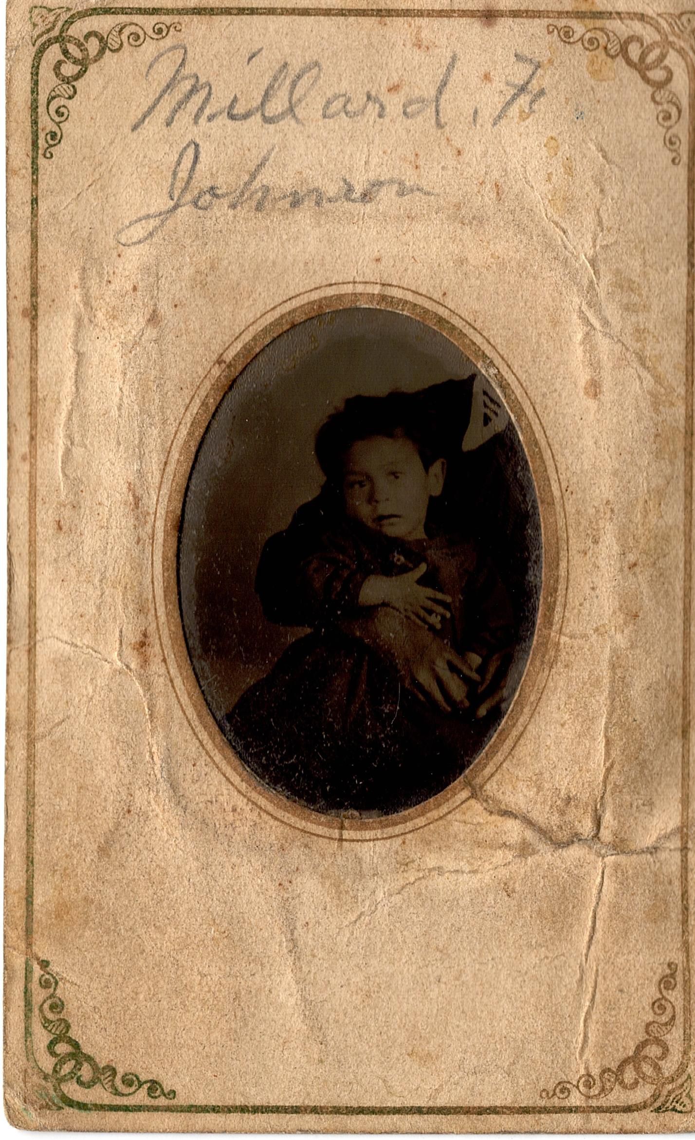 The border is dirty, stained, and is creased along the edges of the tintype which is thicker. The back of the paper is also stained most likely from the adhesive to attach the tintype, but could also be from it being attached to something else. The tintype itself has a ring that follows the border of the paper, most likely from oxidization.