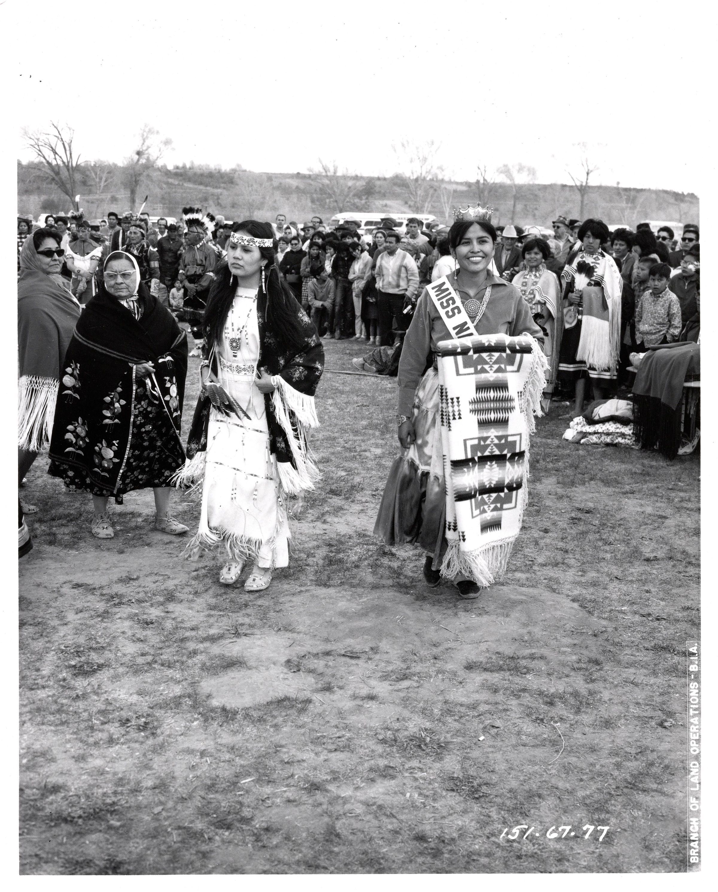 Black and white photo of Native women in traditional regalia with a crowd of onlookers behind them. The woman on the right is wearing a crown and holding a woven blanket draped over her left arm. She has a sash that starts "Miss N" but is covered by the blanket, original accession sheet says it's Miss Navajo but could be Miss Native America. The woman to her right is wearing a shawl with fringe and holding a feather fan in her right hand. She is wearing a buckskin dress with fringe and bead accents and a headband. There are two older women to her right wearing shawls and moccasins. Typed in the bottom right corner is "Branch of Land Operations - B.I.A." and written in white ink "151-67-77" in the same corner but different orientation.Collection