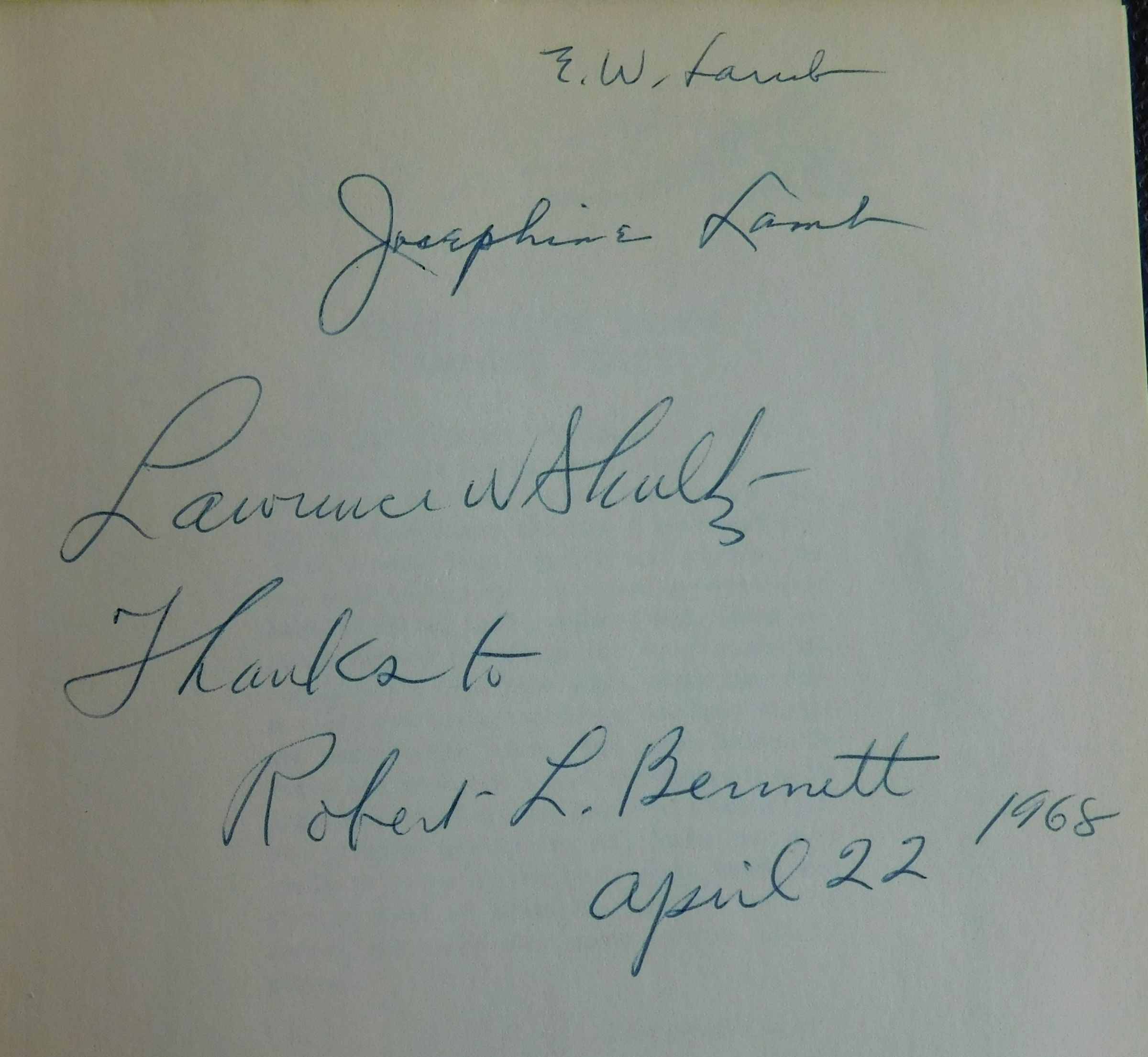E.W. Lamb, Josephine Lamb, Lawrence W. Shultz. Thanks to Robert L. Bennett, April 22, 1968Other Names and Numbers